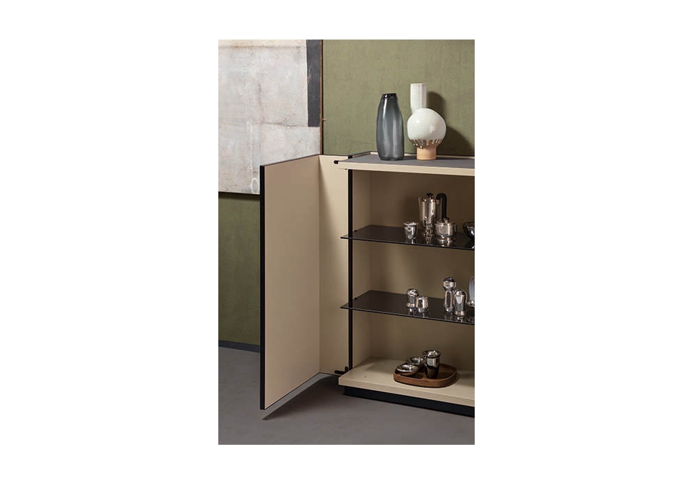 Cornice designed by Pianca is a sideboard with casket opening of the external side doors. Made of Essenza wood or lacquered or covered in synthetic leather, plinth in matt slate finish and internal shelves made of lead transparent glass. Available in different models.