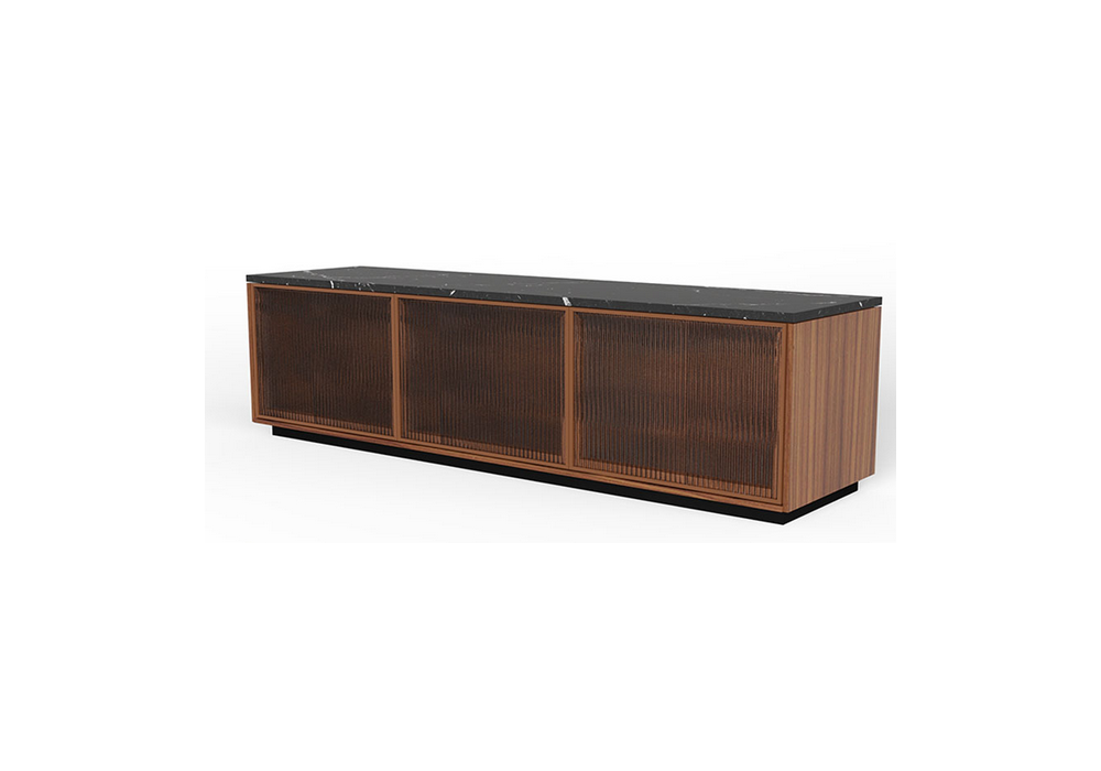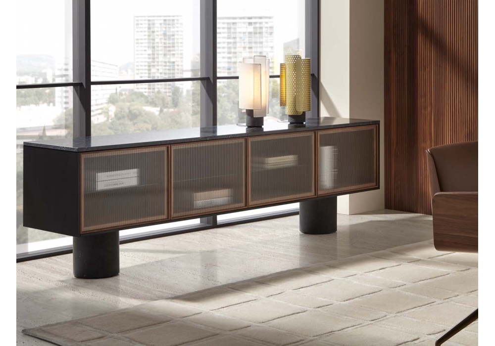 Rio designed by Sebastian Herkner for Punt is a sideboard with an MDF structure with oak or walnut veneer, top and feet/base in wood or Marquina marble. Hinged doors without handles made of solid oak or walnut and wavy tempered glass. Each module includes an internal shelf in tempered glass with fixing in the center.