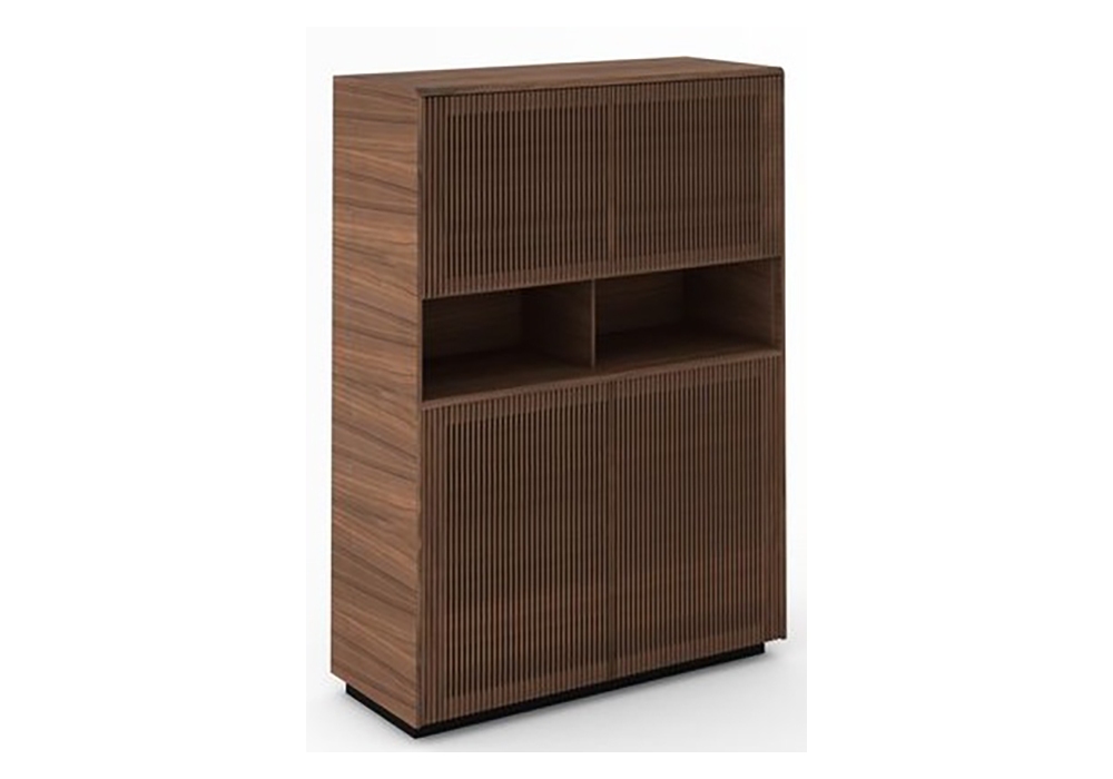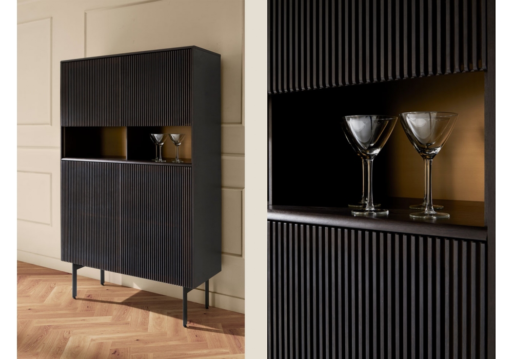 Malmö designed by Mario Ruiz for Punt is a cupboard with structure in MDF veneered with oak or walnut wood. Hinged doors without handle and base in black or bronze thermo lacquered steel with adjustable feet. Available in different finishes and versions.