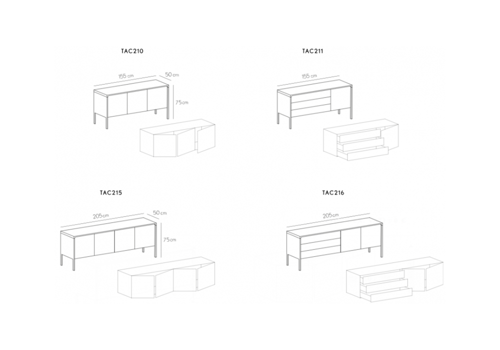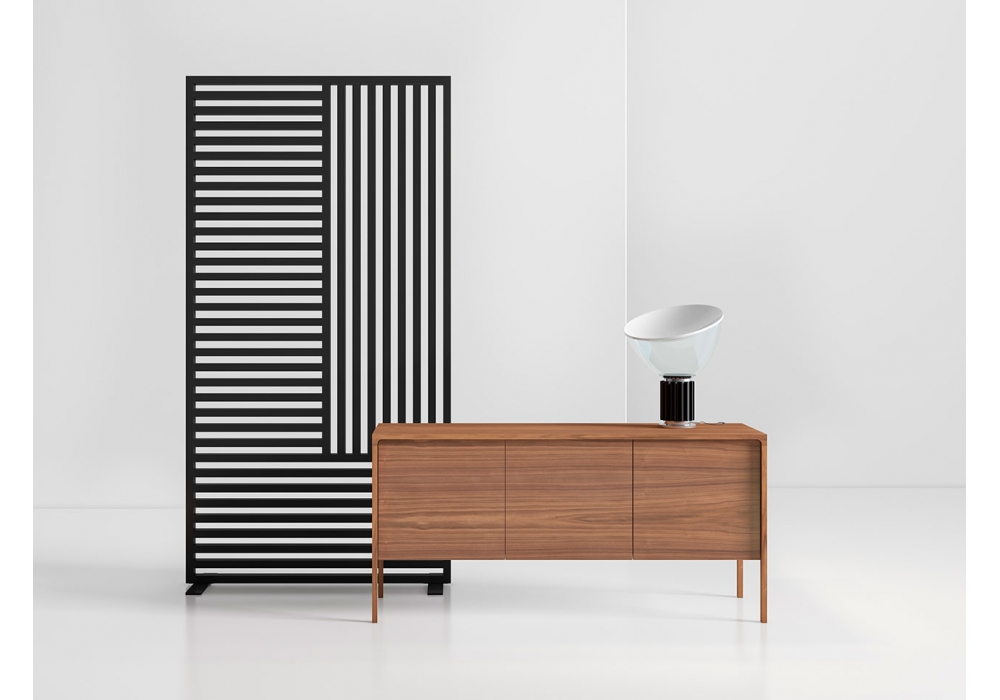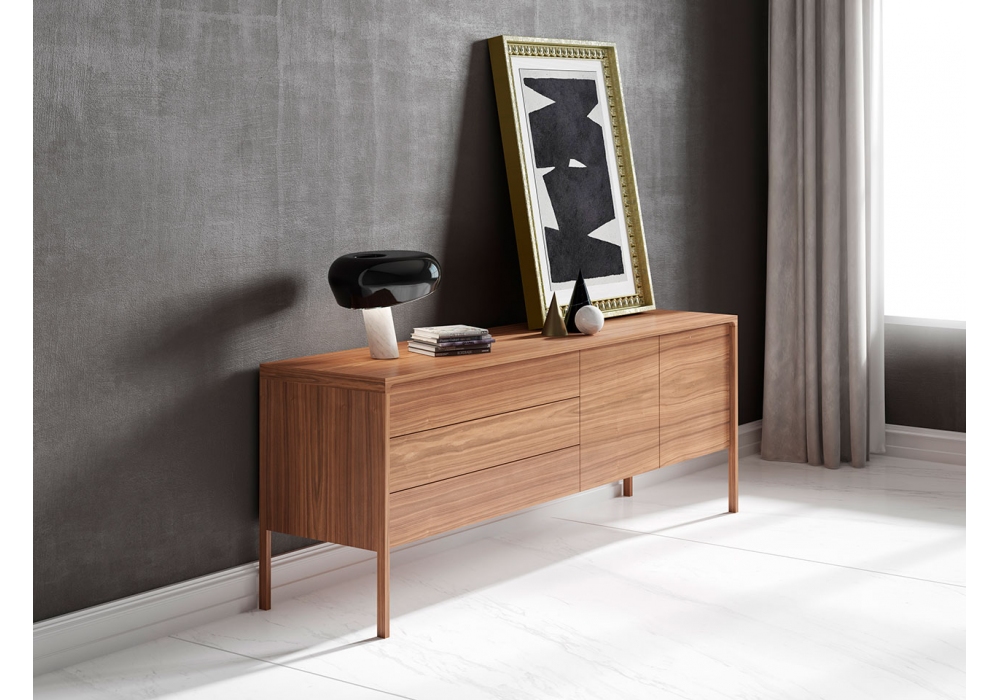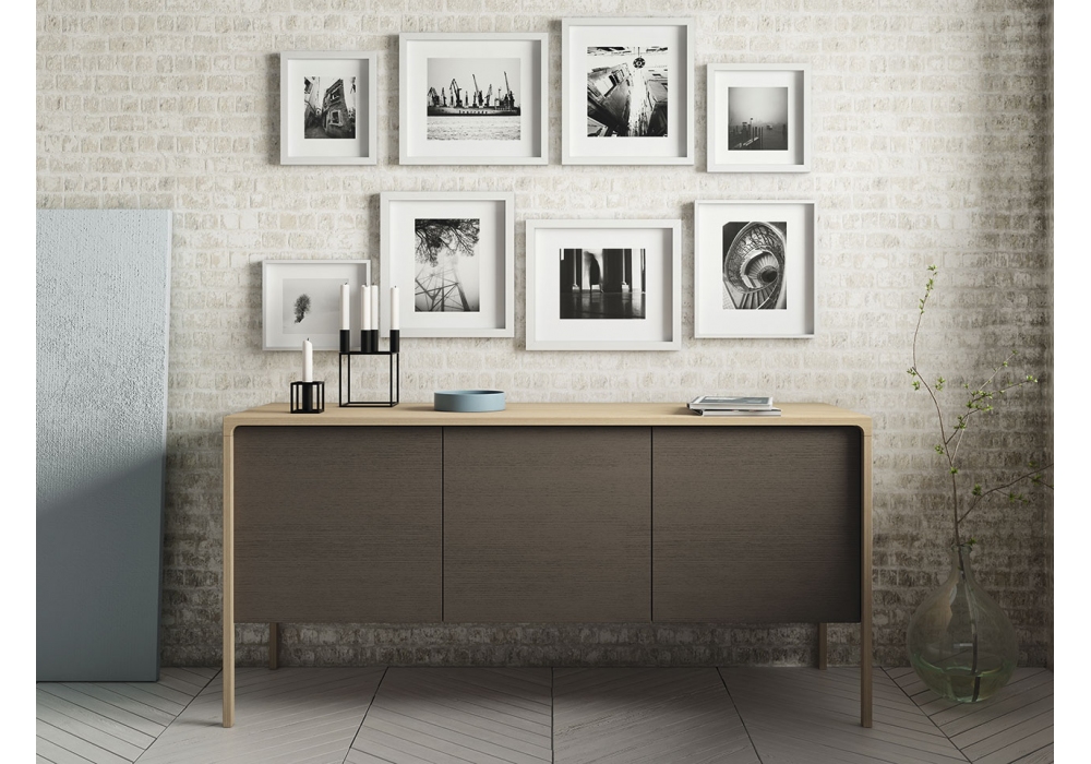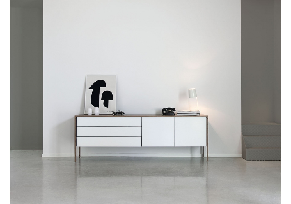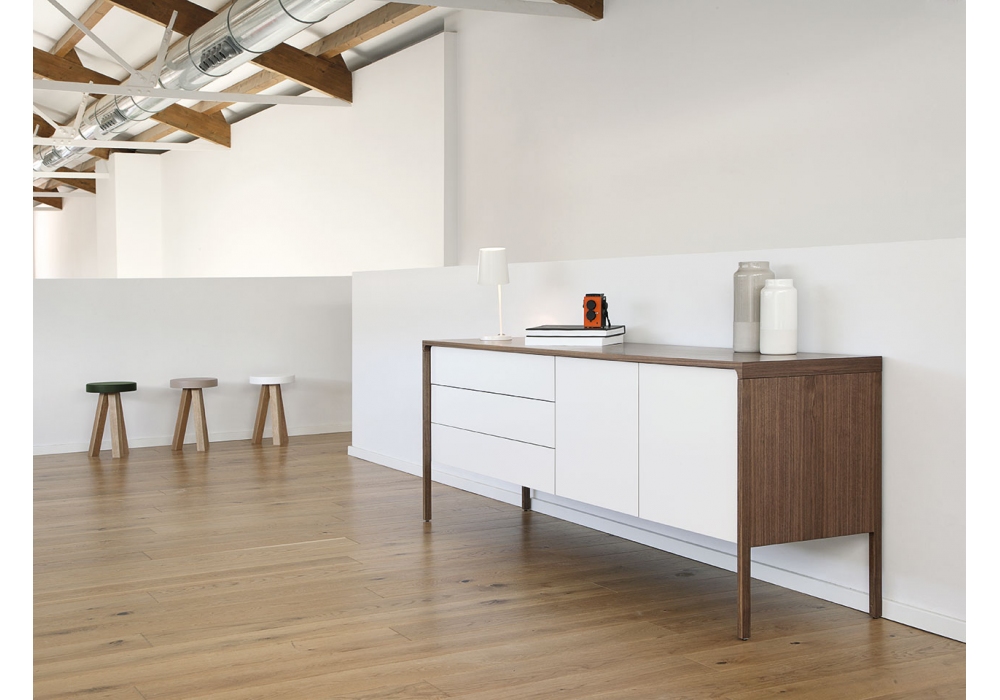 Tactile designed by Mario Ruiz for Punt is a sideboard with MDF structure veneered with oak or walnut wood. Doors without handle in veneered wood or lacquered metal. Available in different versions and finishes.