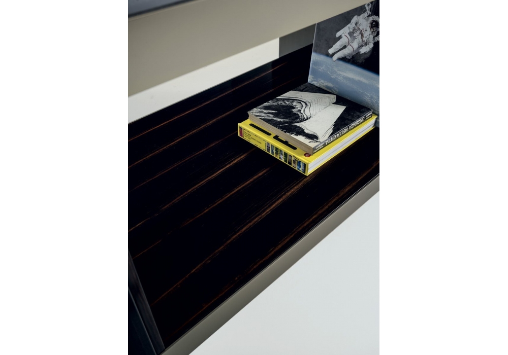 Aspen Evo designed by iuseppe ViganĂ² for Longhi is a low cabinet with wooden structure in essence or covered in leather. Metal parts in glossy or matt finish and top in wood, marble, mirror or crystal. Available in the version with open compartment or with flap door.