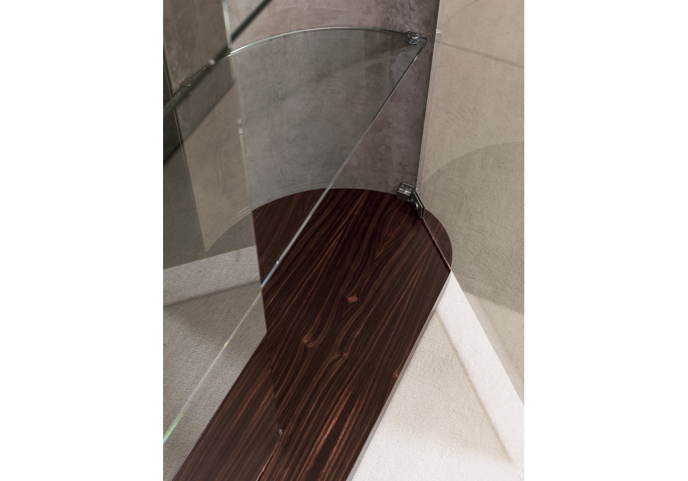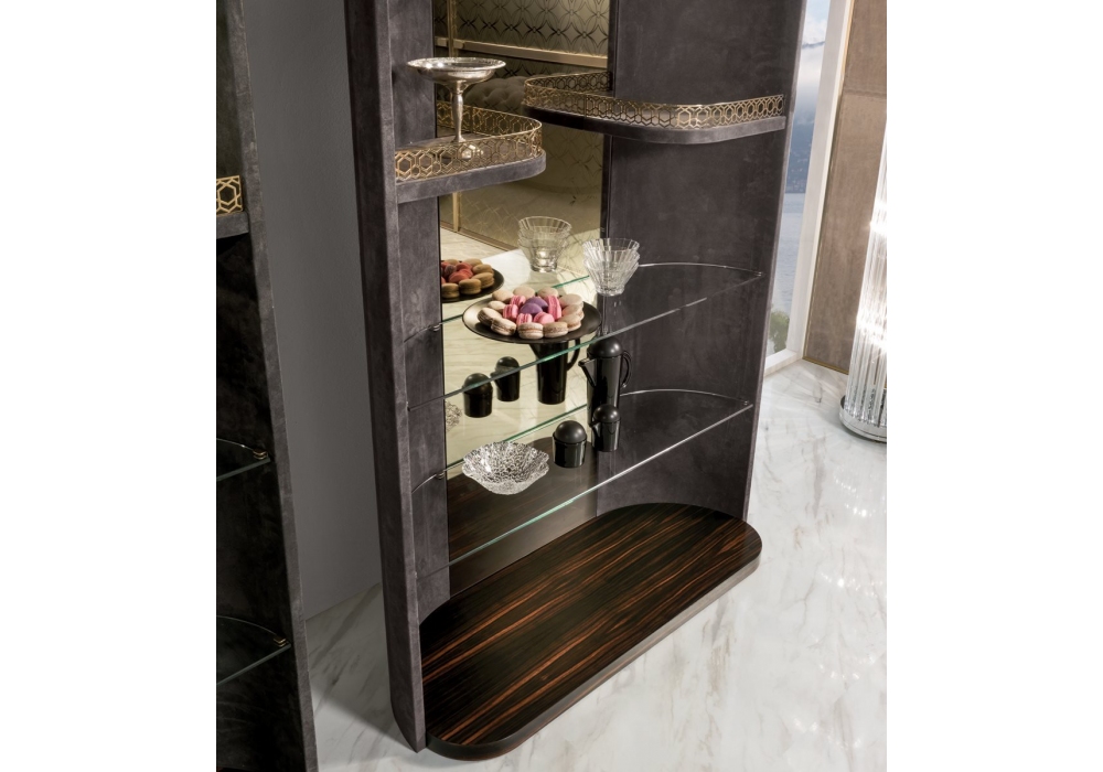 Hennesy designed by Giuseppe Iasparra for Longhi is a showcase with or without glass doors. Curved structure covered in leather and central part in mirror. Shaped shelves in transparent glass with metal parts with Sequence motif. Upper and lower surface in opaque ebony; the upper floor is illuminated by led spotlights.