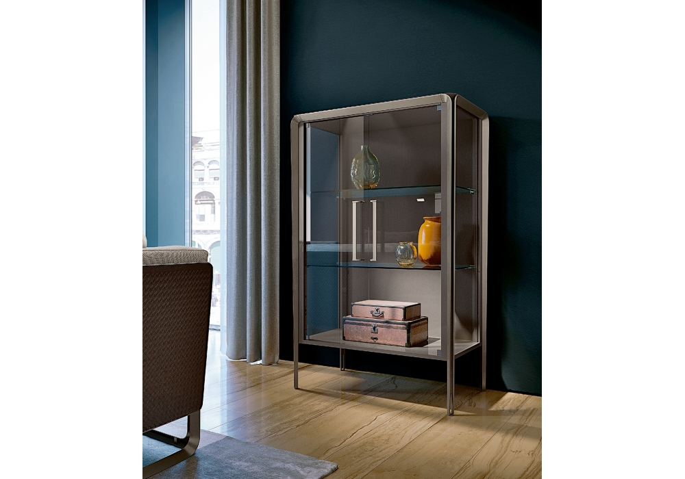 Milano designed by Blengini Ghirardelli for Turri is a showcase with structure in MDF and solid wood in glossy lacquered polyester finish with glass side panels. Legs in curved brushed nickel metal with leather inserts. Inside there are two glass doors.