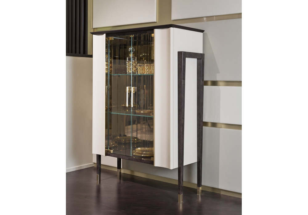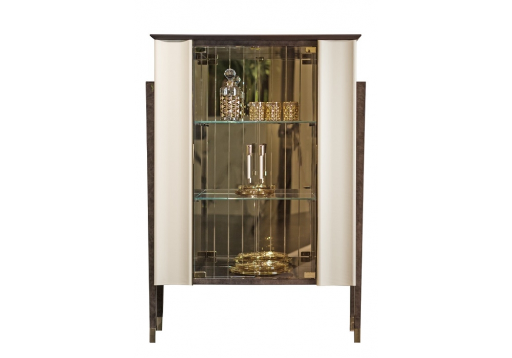 Noir designed by Andrea Bonini for Turri is a showcase with structure in MDF and particle board panels with hand-decorated glossy polyester finish. Inside there are two side compartments with four glass shelves and a central compartment with two glass shelves with bronzed mirror walls. Metal parts in light gold or bronze finish.