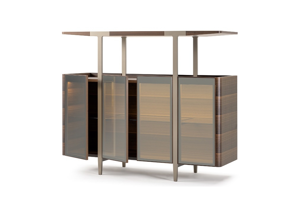 Domus designed by Matteo Nunziati for Turri is a cabinet with structure in MDF and particle board panels with heat-treated Eucalyptus veneer. Doors in reflective glass or in heat-treated Eucalyptus veneered wood. Inside there are three compartments with glass shelves. Metal legs in matt platinum finish. On request it is possible to add internal LED lighting.