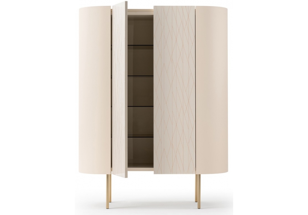 Roma designed by Monica Armani for Turri is a cabinet with structure in MDF and plywood with a glossy lacquered finish and leather upholstery. Wooden doors with or without decoration and metal legs in different finishes. Inside there is a compartment with four glass shelves.