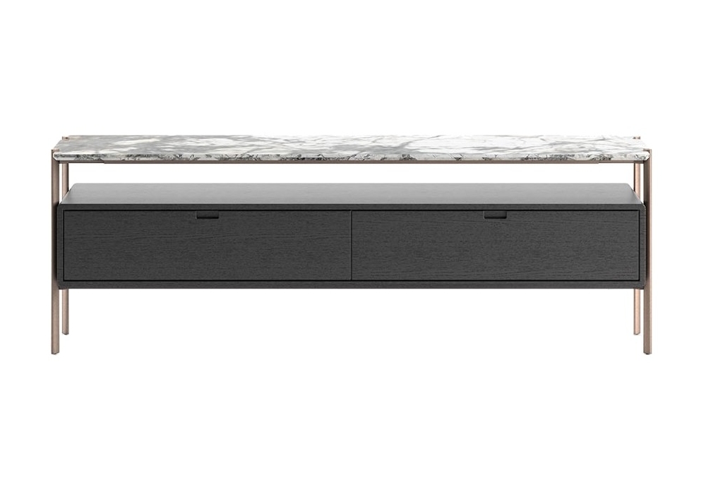 Eros designed by Studio 63 for MisuraEmme is a sideboard characterized by a bronze metal structure supporting the black oak container and the marble top. Available in two dimensions.