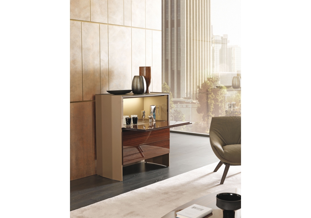 Milvian designed by Francesco Lucchese for MisuraEmme is a sideboard made with marble or acid-etched glass top and painted aluminum sides. Available in two solutions: high sideboard and low sideboard. The high sideboard has a main flap opening for bar use. The low sideboard is equipped with two doors with flap opening. Internal compartment in glossy lacquered finish and completely concealed opening mechanism. Fronts in matt or glossy essence.