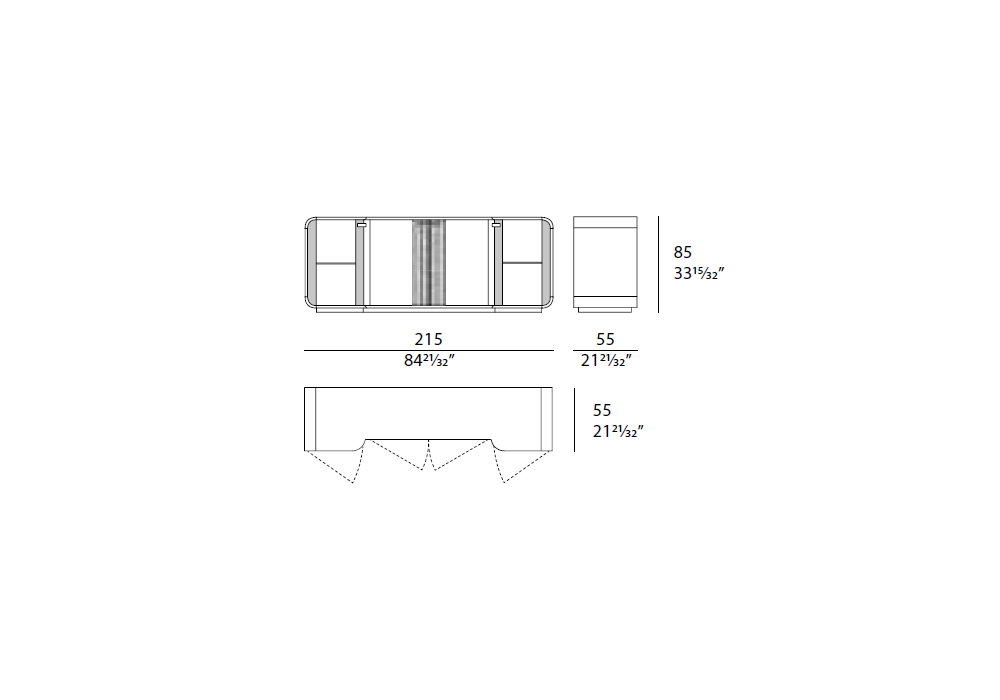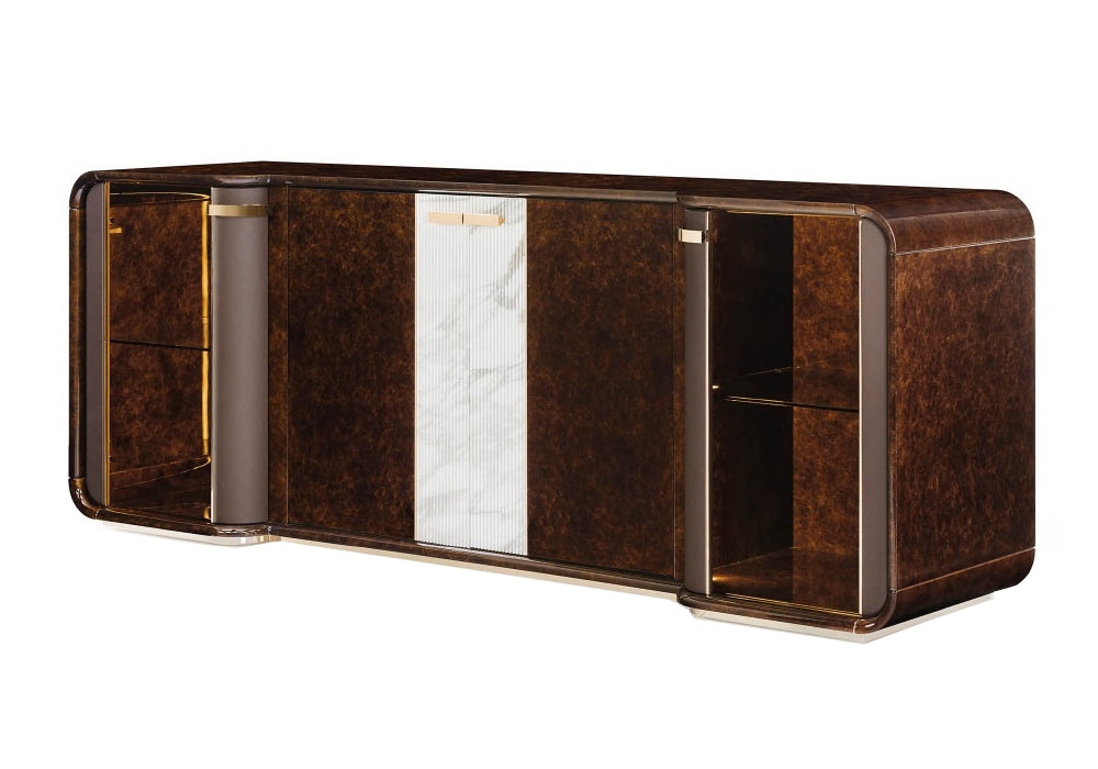 Madison designed by Andrea Bonini for Turri is a marble sideboard with MDF structure and veneered particle board panels with glossy finish. Two doors are made of bronzed glass with inserts in leather and two in wood in a glossy lacquered finish with decorative details in marble. Inside there are two side compartments with a bronzed glass shelf and a central compartment with a glossy lacquered shelf. It is possible to add a led lighting set with or without sensor.