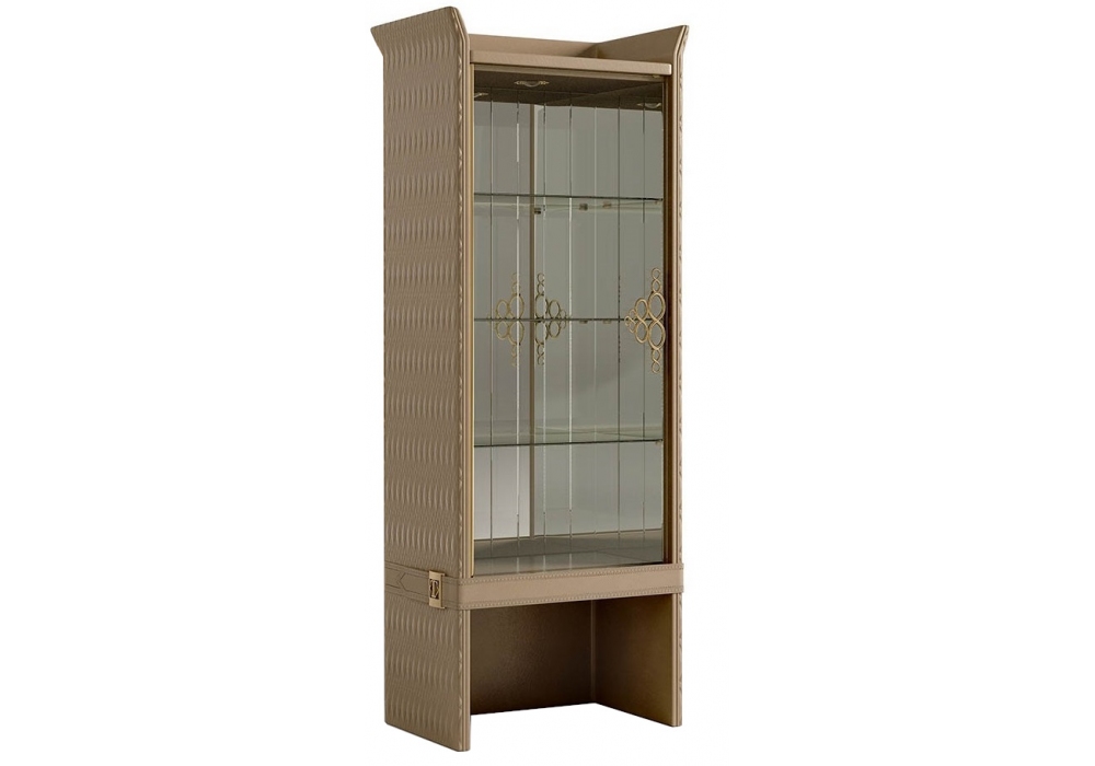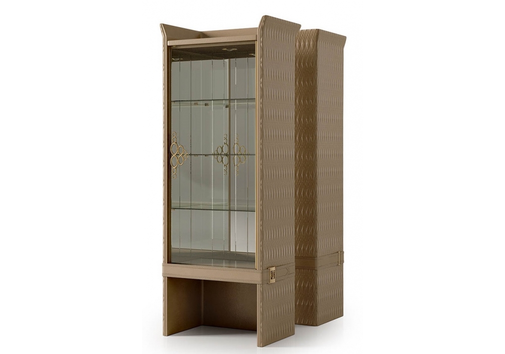Numero Tre designed by Roberto Serio for Turri is a showcase with structure in MDF, solid wood, multilayer and particle board panels in glossy lacquered finish with back fully or partially upholstered in embroidered leather. Inside there is a compartment with bronzed mirror walls with three glass shelves. Available in different dimensions.