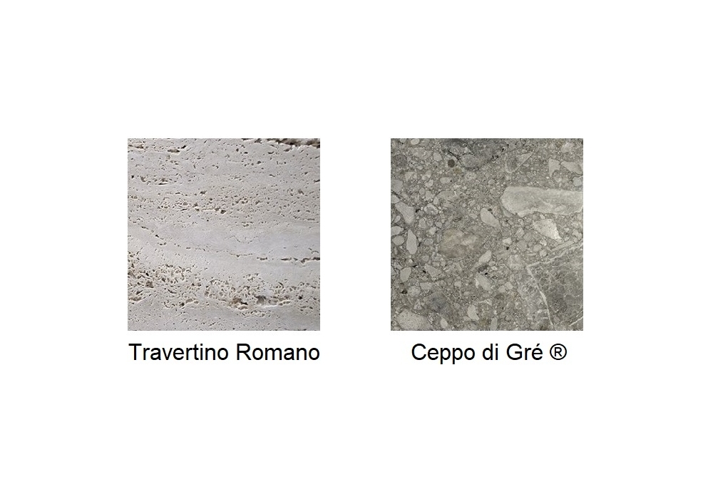 natural brushed Travertino Romano (not treated with resin) or brushed Ceppo di Gré ® top. Upon request 8mm extralight tempered shaped upper shelf. The module with doors can be supplied with an extralight glass internal shelf and the module with big drawer can be supplied with an internal drawer. Available in standard compositions.