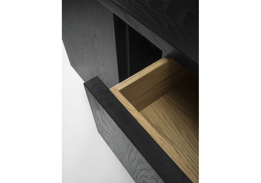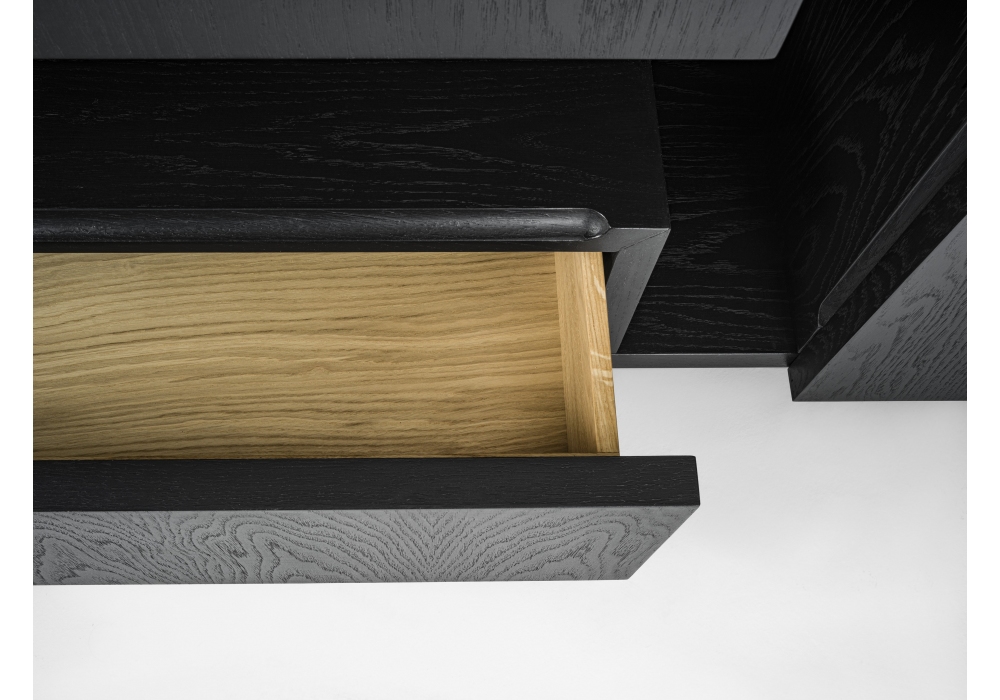 Essenza designed by Daniel Germani for Riva 1920 is a sideboard in solid wood and blockboard, characterized by hinged doors and drawers assembled with dovetail joints, with central open compartment. Inside glass shelves.