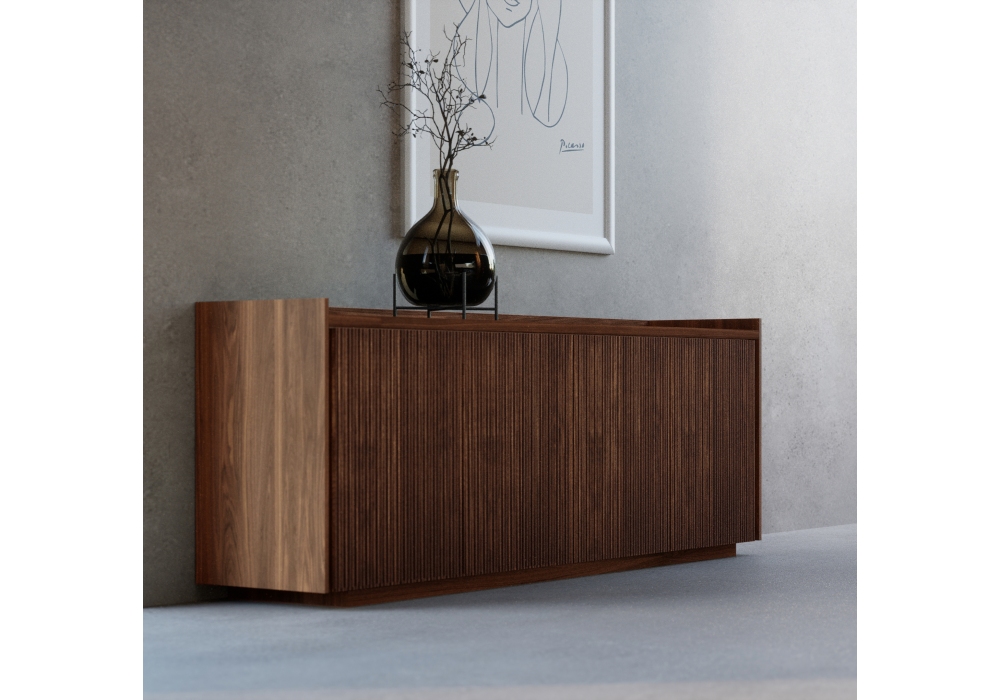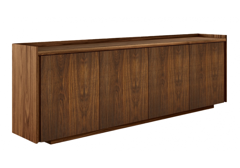 Revo designed by Giuliano & Gabriele Cappelletti for Riva 1920 is a sideboard in blockboard and solid wood, characterized by a frame that contains the top, with internal drawers made with traditional dovetail joints and milled through handle. The particular vertical processing of the Fresart drawer fronts creates a modern and dynamic geometric effect.
