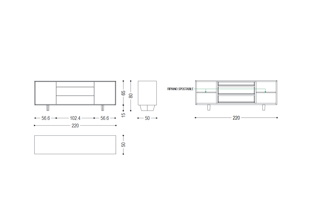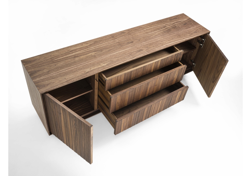 Vela designed by Giuliano & Gabriele Cappelletti for Riva 1920 is a sideboard in solid wood and blockboard, characterized by a particular vertical manufacturing of doors and drawer fronts which creates a modern and dynamic geometric effect. Drawers assembled with dovetail joints.