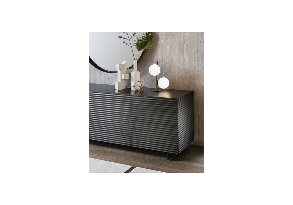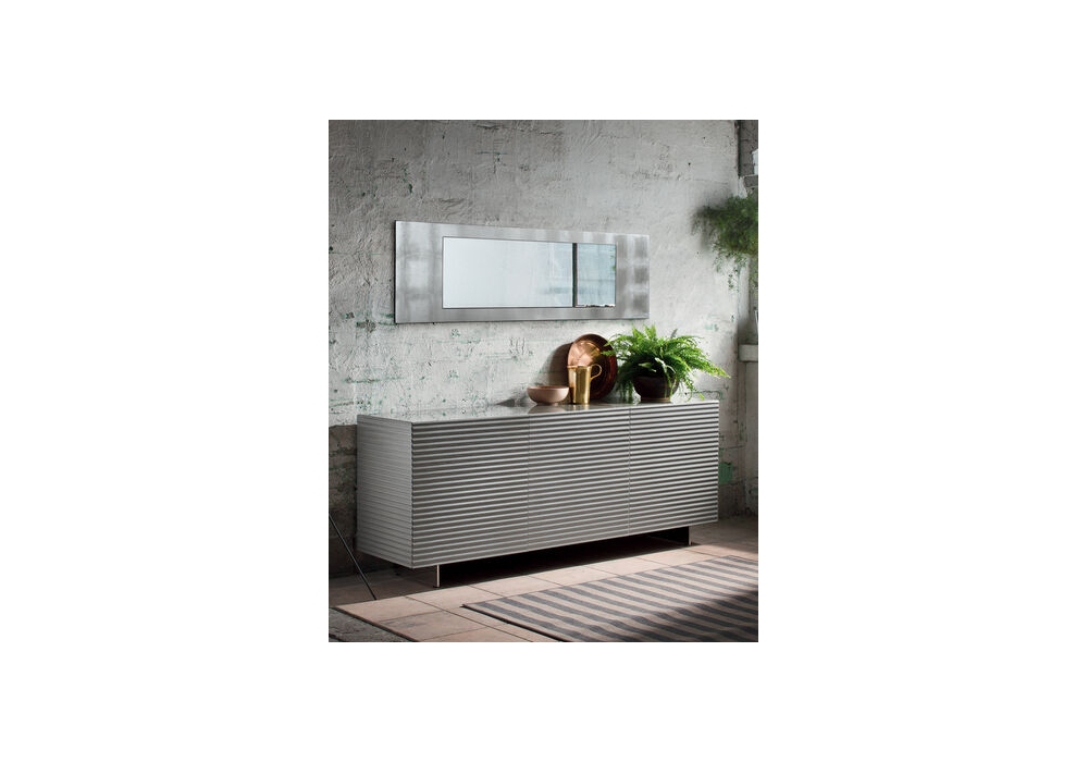 Ola signed by reflections is a sideboard with doors and fine in lacquered painted wood or hand -brushed wood, processed with a special wavy incision. The top can be made of painted wood, mirrored or ceramic crystal. Push-Pull opening and internal transparent crystal shelves.