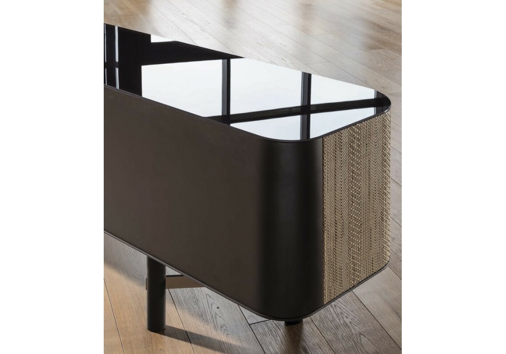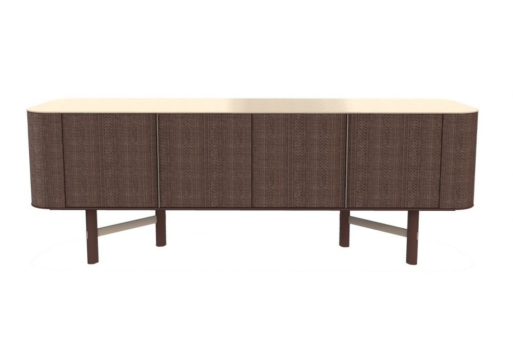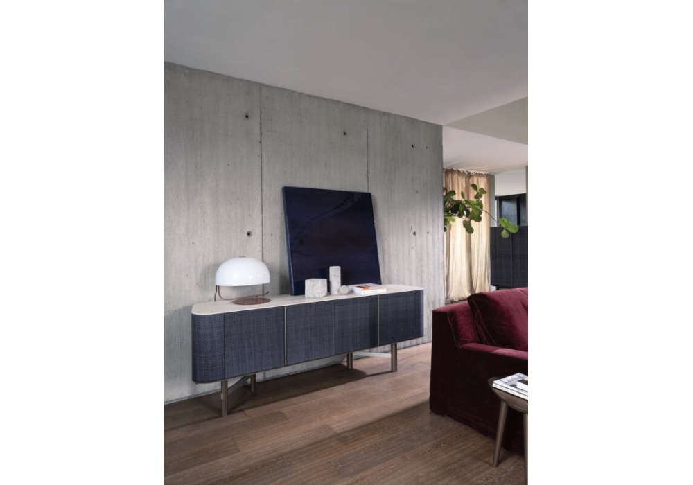 Daen 69 designed by Federico Peri for Gervasoni is a sideboard with shell in plywood and lacquered MDF. Four doors covered in water-repellent and washable Vibes eco-leather with adjustable internal shelf. Base composed of legs with an elliptical section made of lacquered solid wood connected by steel bars. Top in porcelain stoneware or glass painted underneath.