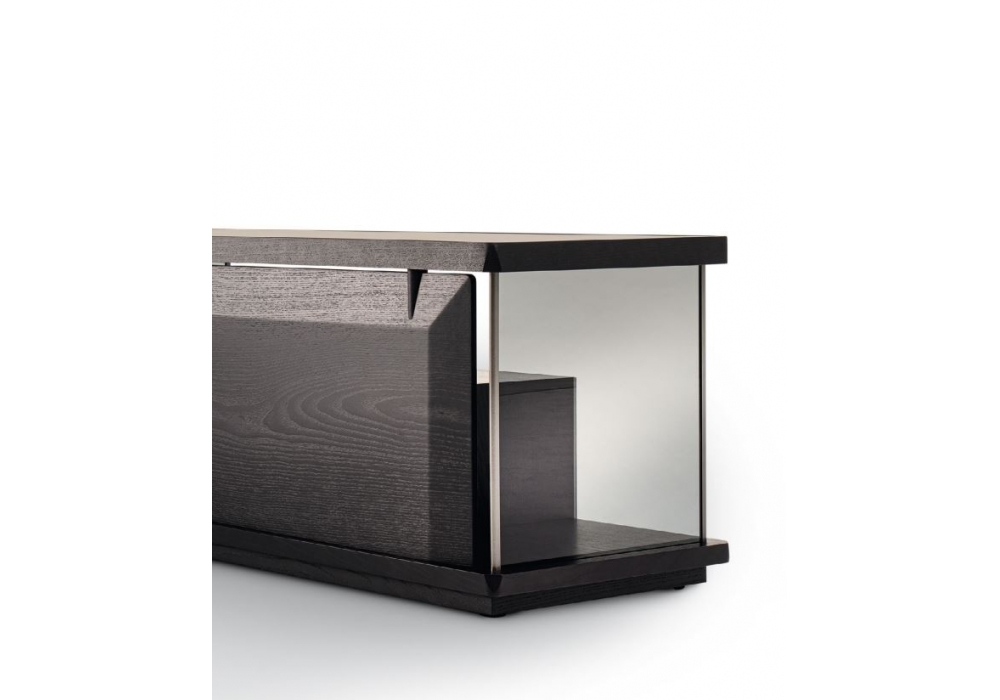 Kukei designed by Mauro Lipparini for Giorgetti is a sideboard available in two versions: symmetrical or asymmetrical. Both versions are available with a pewter finish painted metal base and feet in pewter finish painted metal and solid ash in different finishes, or with an ash base, in the same variants. The top is available in ash, marble or leather. The chest of drawers is in ash and the fronts of the 2 drawers are covered in leather. The rear of the chest of drawers is illuminated by an LED profile.