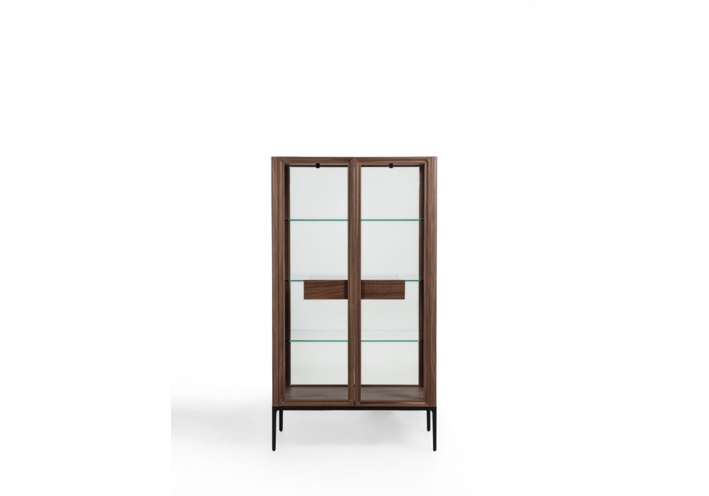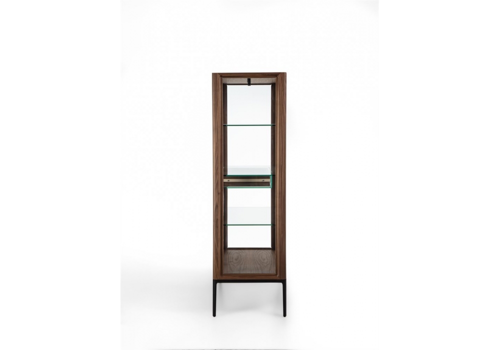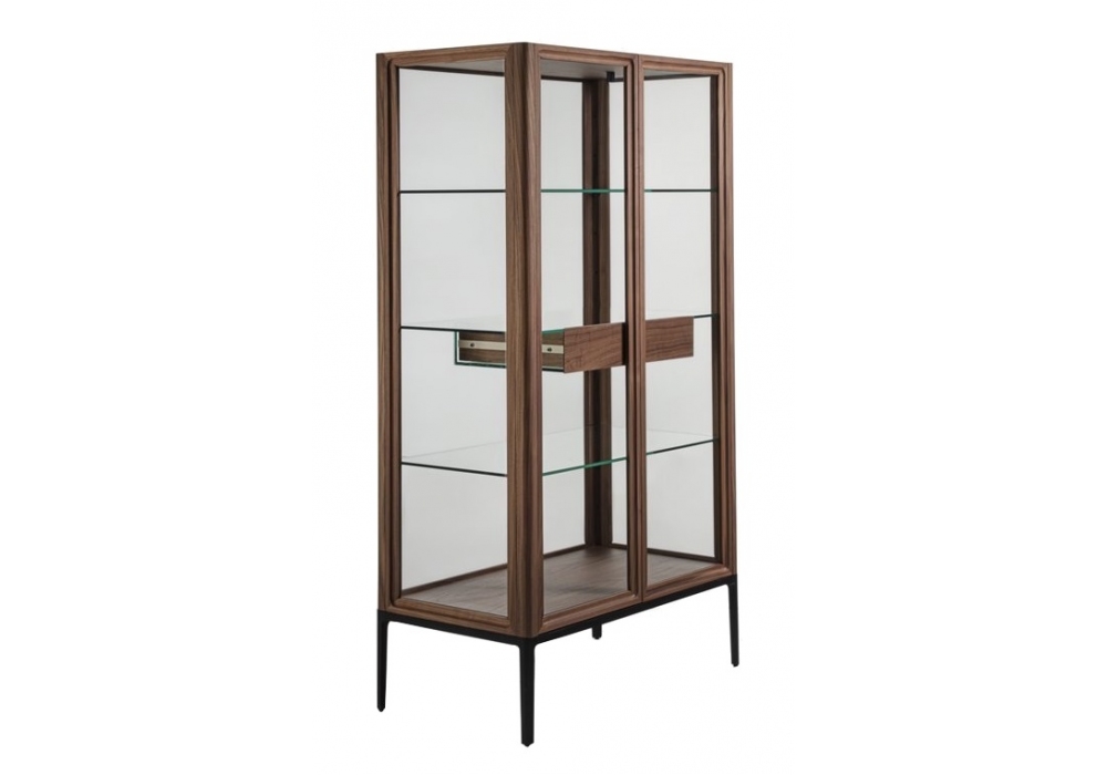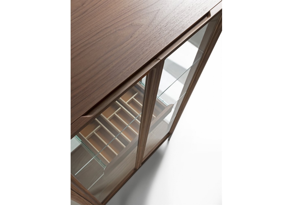 Atsuko designed by D. Dolcini for Porada is a cabinet with structure in solid canaletta walnut, transparent crystals and base in matt black metal. Internal drawer in canaletta walnut with guides in natural maple. Inside the drawer there are two trays in natural maple with a Cuoietto covered bottom. Integrated LED lighting dimmable via remote control or APP.
