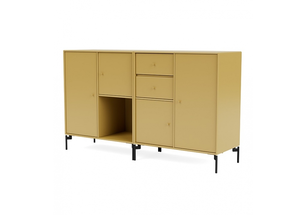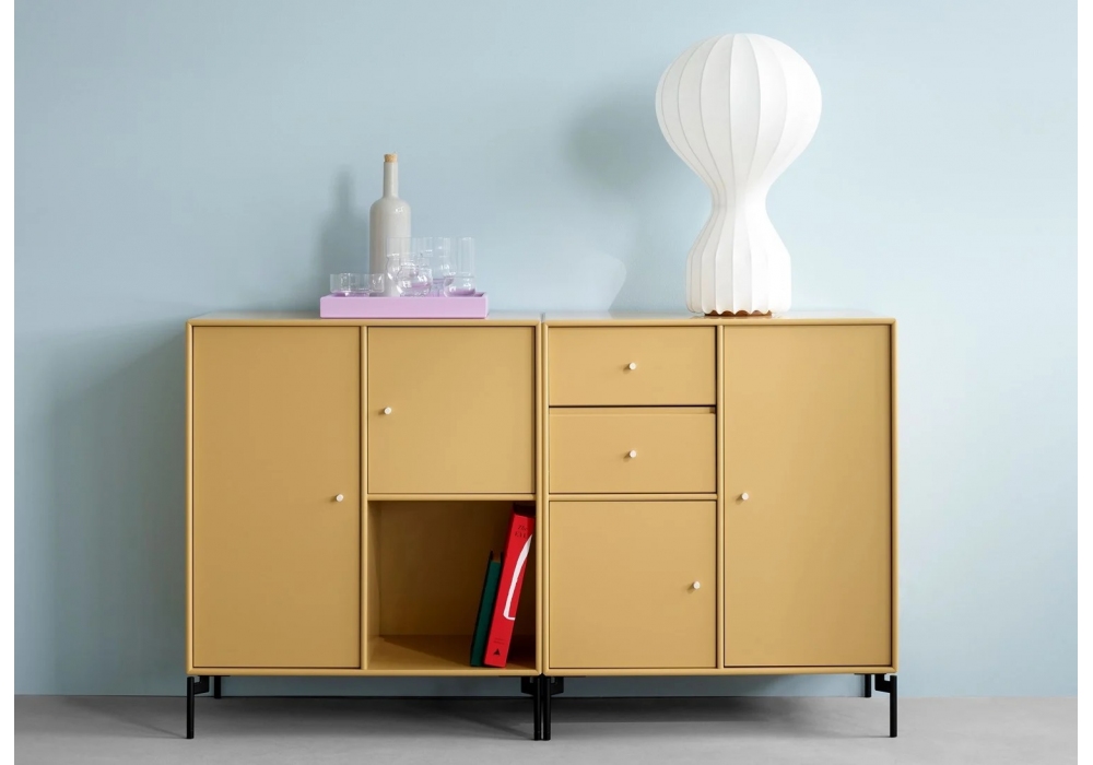 Couple designed by Peter J. Lassen for Montana is a sideboard, perfect for storage in the living room, hallway or kitchen that provides the opportunity to both display and hide items. It is a spacious sideboard composed of two drawers, one open shelf and various cabinets that range in sizes. Available in different lacquer colours. With legs or, on request, also available on suspension rails or plinth.