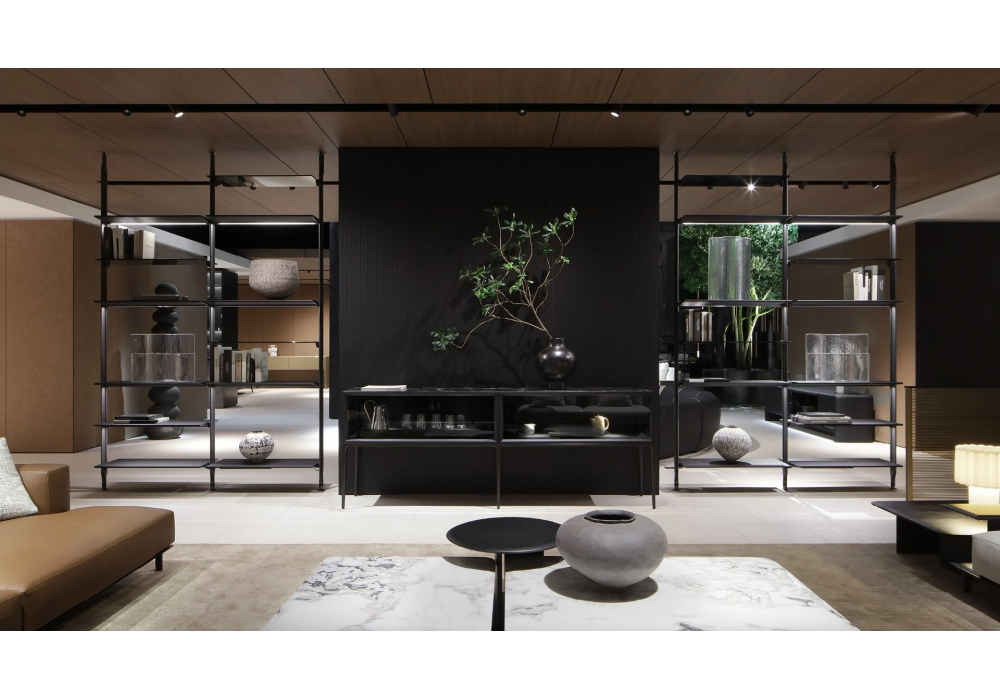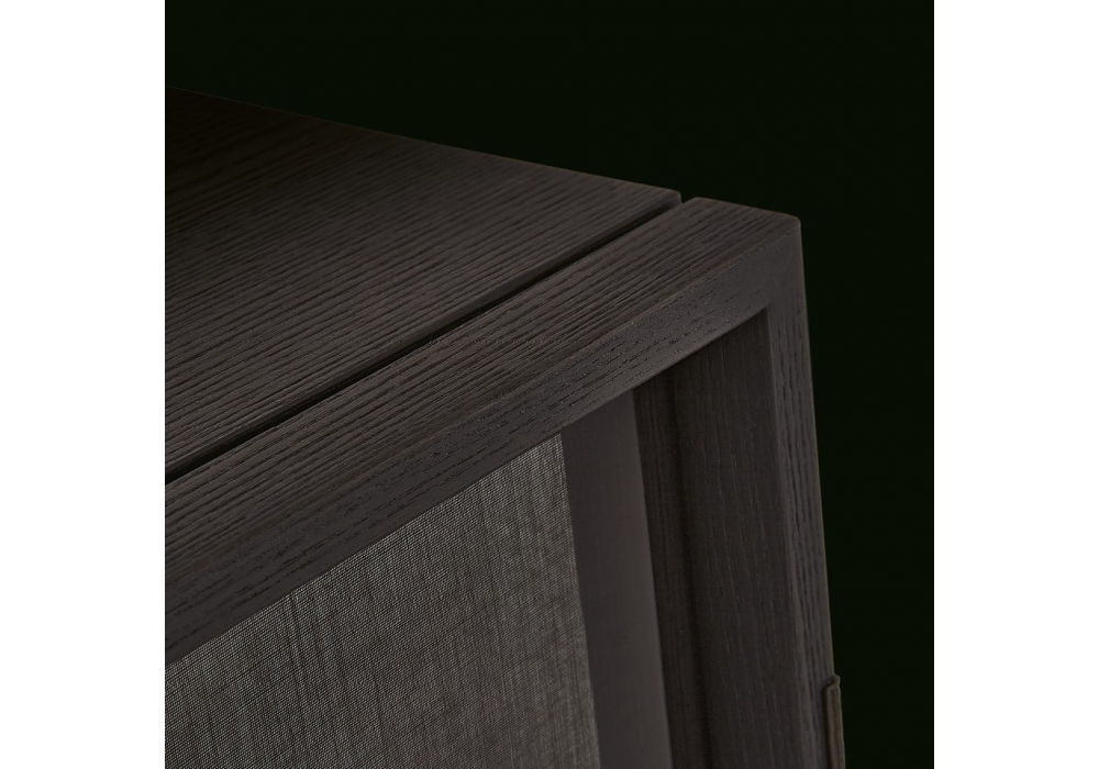 Aiko designed by Jean Marie Massaud for Poliform is a sideboard with double flap doors (MAK6 - Salone del Mobile 2024). Structure in black elm. Backrest/s in black elm or extralight transparent glass. Lateral sides and fronts in black elm or extralight transparent glass. Handles in matt brown nickel, built-in in the upper door profile. Top in black elm or in mat and glossy marble. Base with feet in mat brown nickel painted metal.