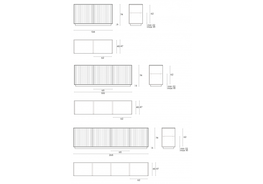 | Dimensions | 134 x 47 x H 74 cm; 199 x 47 x H 74 cm; 265 x 47 x H 74 cm. |