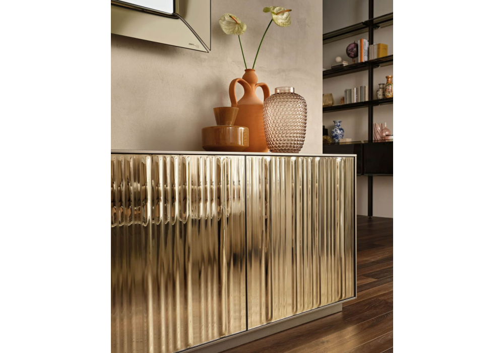 Echo Line designed by Marcel Wanders Studio for Fiam is a sideboard with structure in white, volcano gray or metallic greige lacquered wood. The internal shelves are in tempered smoked glass. The doors are in fused tempered glass with a vertically striped surface. Echo Line is available in different sizes and finishes.