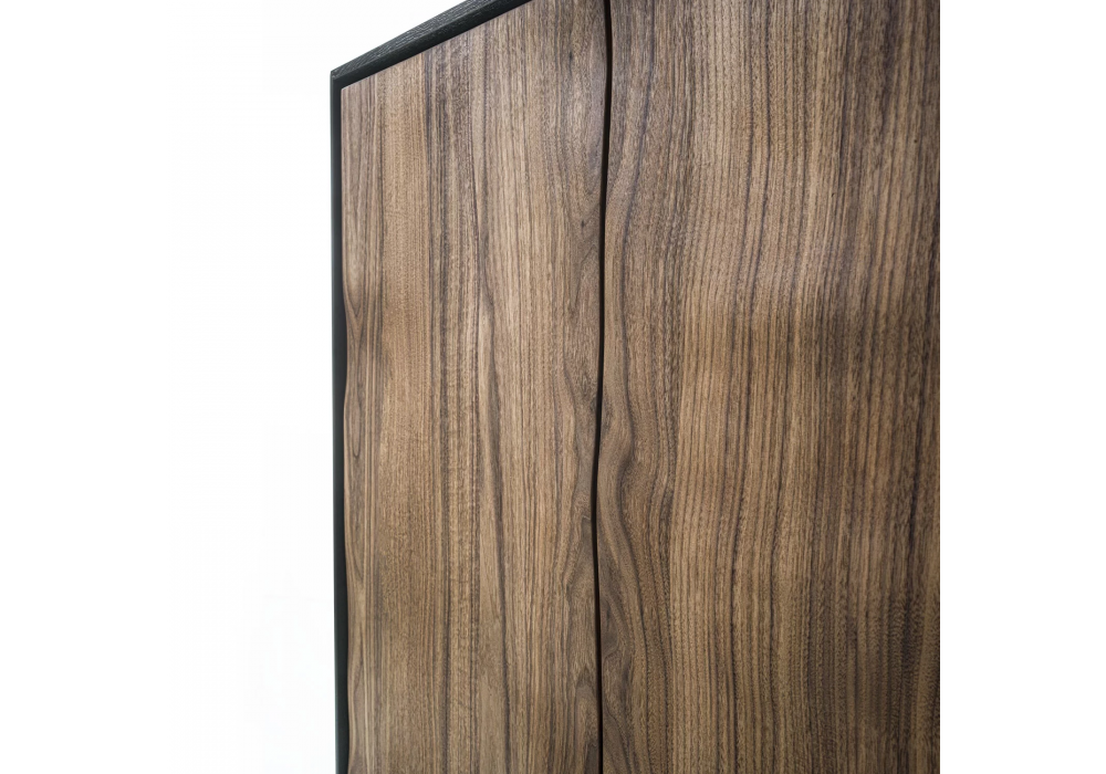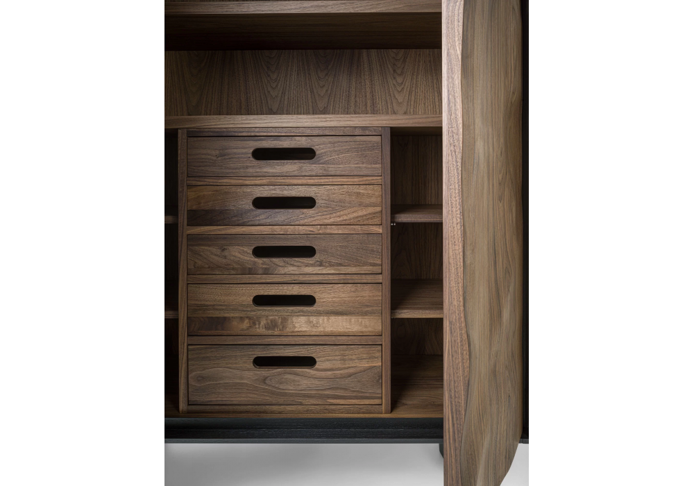 Move High designed by Authentic Design for Riva 1920 is a high sideboard in solid wood and blockboard, enclosed by a wooden frame. Inside, shelves and drawers assembled with traditional dovetail joints and milled through handle. The particular workmanship on the doors creates a sculptural effect through the extrusion of the wood, giving it a sinuous movement.