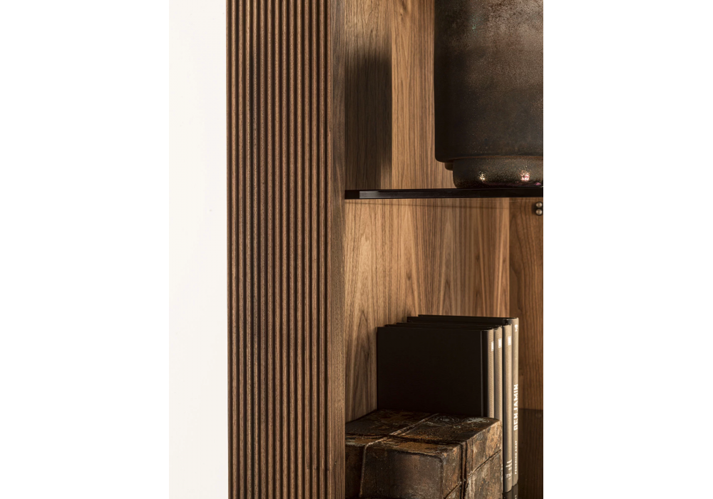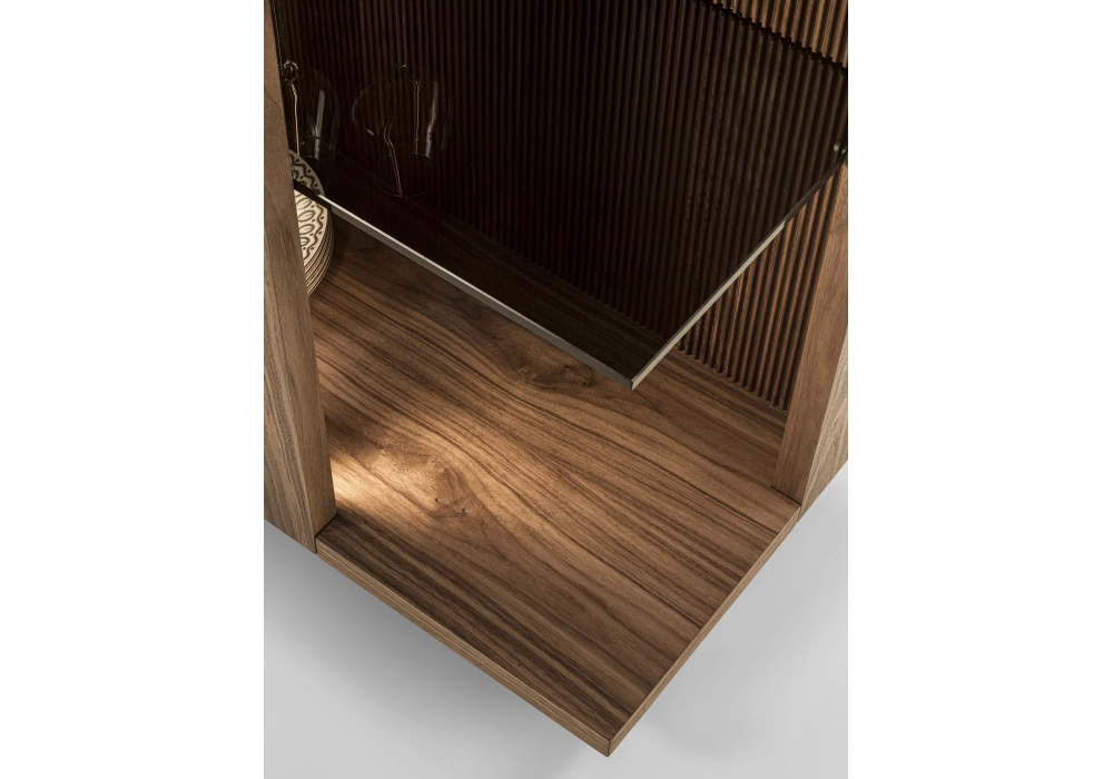 Revo Open designed by Giuliano & Gabriele Cappelletti for Riva 1920 is a high sideboard in solid wood and blockboard, equipped with three glass shelves. Wooden top and base. Available in two versions: with a backrest characterized by a particular vertical workmanship, Fresart, which creates a modern and dynamic geometric effect or with Fresart decoration applied on the three vertical structural perimeter bands. Illuminated with LED light system with remote control.