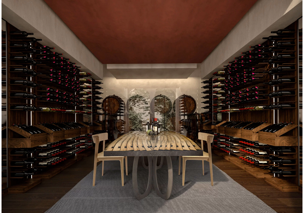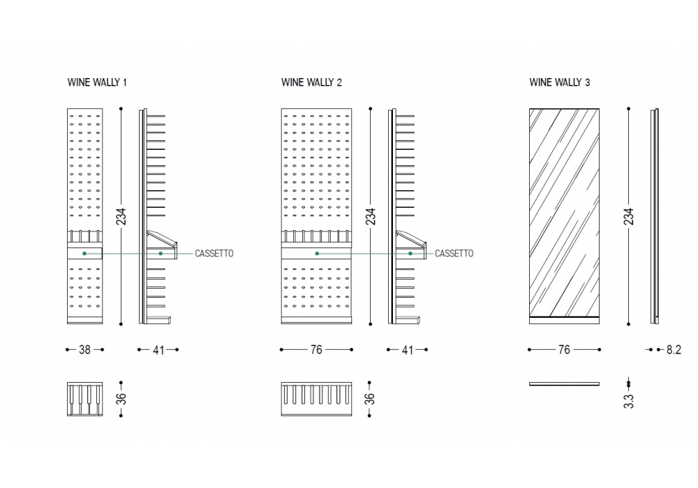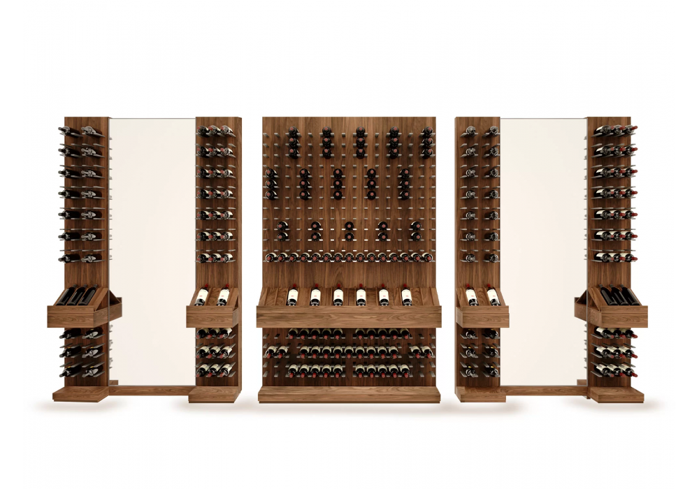 Wine Wally designed by Arkhé Milano for Riva 1920 is a modular open system suitable for displaying wine collections, composed of boiserie panels in veneered blockboard with solid wood supports that allow standard-sized bottles to be housed, alternating with vertical modules in profiled mirror in metal with Irondust finish. Special inclined displays in solid wood allow you to enhance the bottles. The lower part has larger spaces to accommodate large format bottles. Possibility to backlight the panels with LED profiles.
