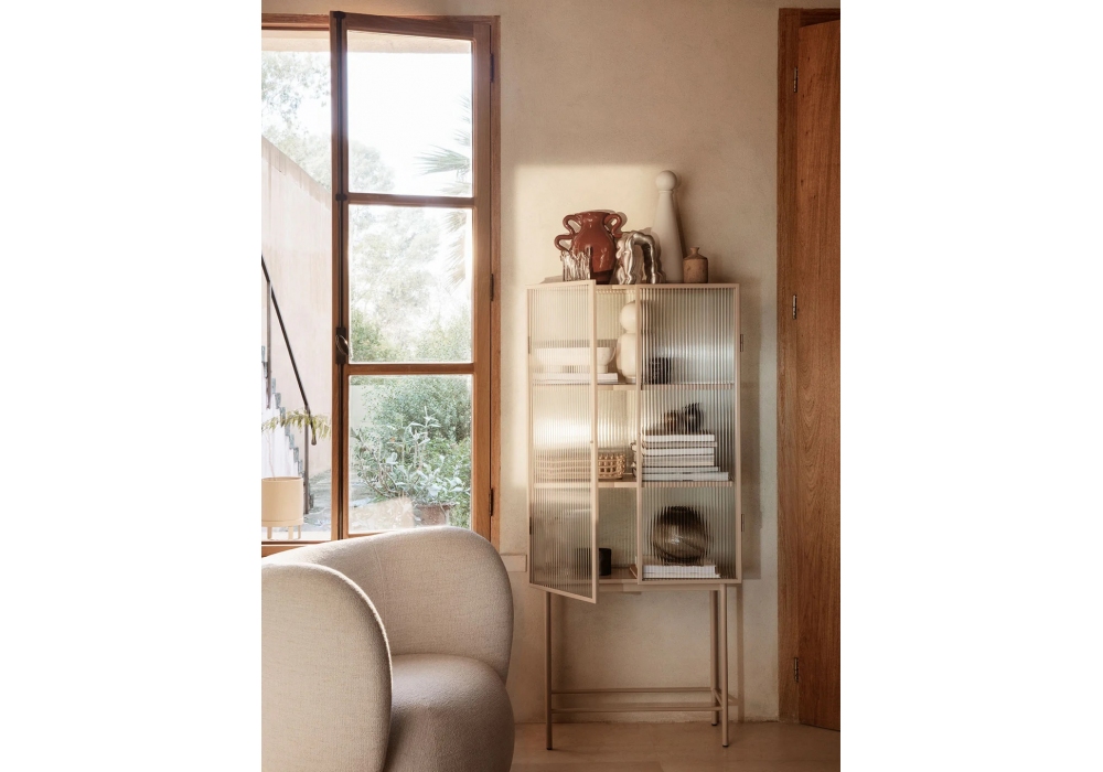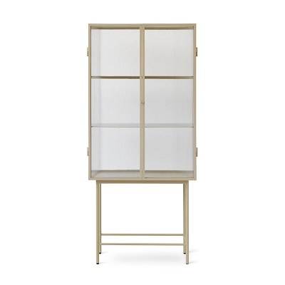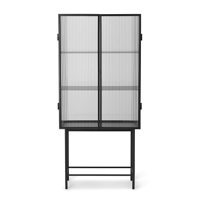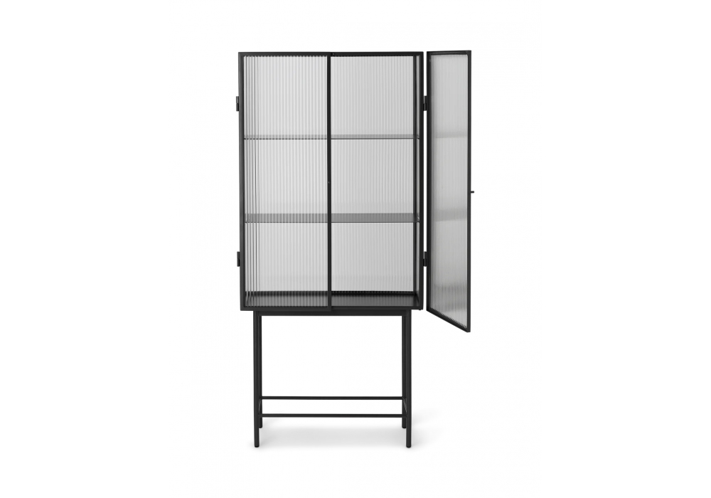 Haze designed by Ferm Living is a showcase with reeded glass doors and powder coated steel structure, available in different finishes. Including two metal shelves, wall brackets and adjustable feet. The glass doors close seamlessly thanks to magnets, and open to reveal two powder coated metal shelves. Use the vitrine to stylishly store beauty essentials or as a modern focal point in your dining room to store dinnerware and more.