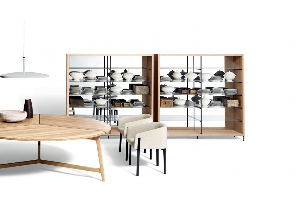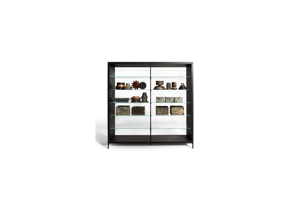 Combi Open Unit designed by Piero Lissoni for DePadova is an open storage unit with uprights and base in matt black powder-coated steel and adjustable metal feet. The panels are in veneered blockboard oak. The shelves and the back are in glass. Combi Open Unit is available in different finishes and with or without a lighting system.