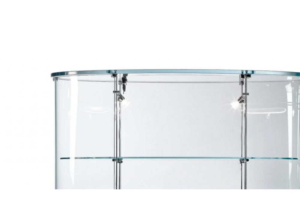 Ellipse designed by Reflex Angelo is a curved glass display cabinet with a base in white or black lacquered glass and a transparent glass top. Lockable door, adjustable shelves and optional lighting system.