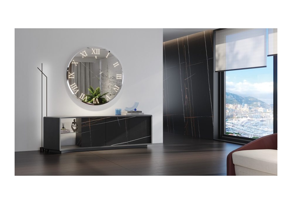 Space designed by Reflex Angelo is a sideboard with structure and plinth in bronze, brass, dark brass or titanium. Doors in MarmoReflex/LegnoReflex. Glass shelves inside, open compartment with shelf in smoked glass.