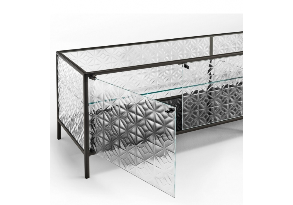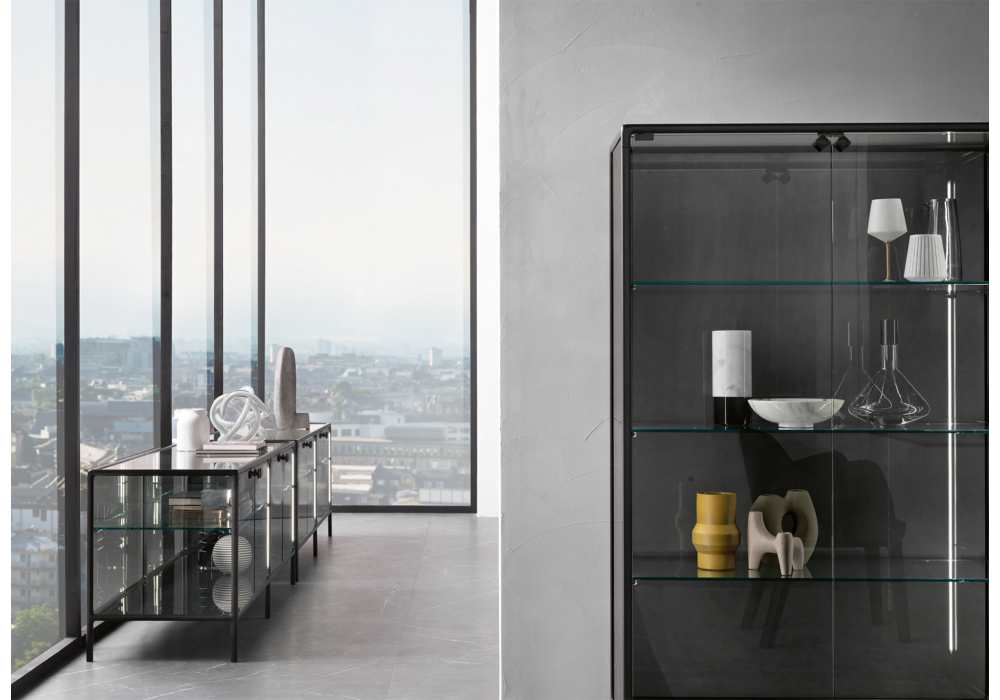 Echo designed by Marcel Wanders Studio for Fiam is a sideboard with a painted aluminum structure, a base in extralight glass painted back to match the structure, a display cabinet body and a glass door. Also available in the version with an LED lighting system integrated into the front uprights.