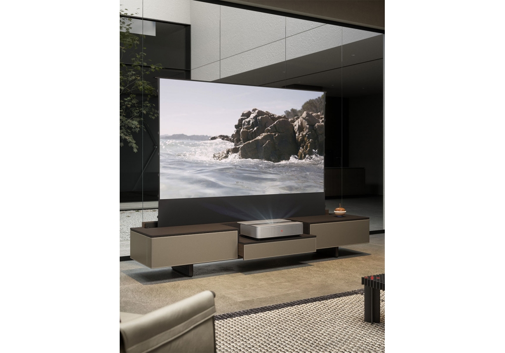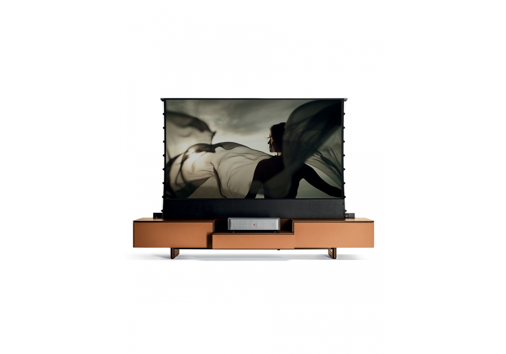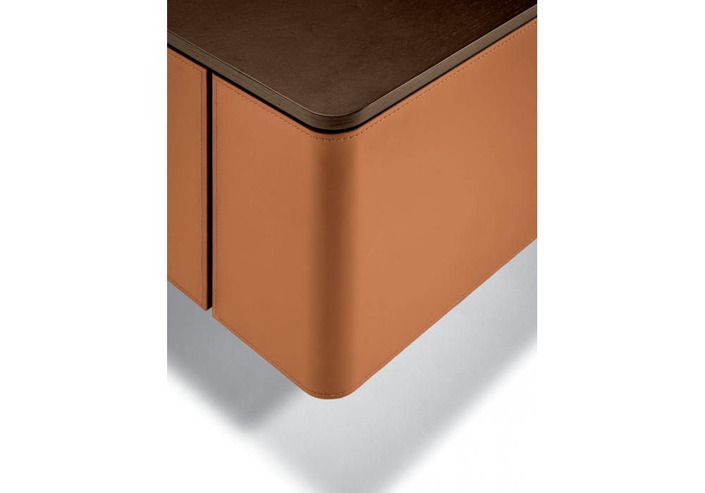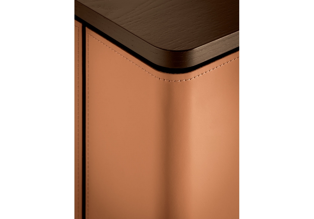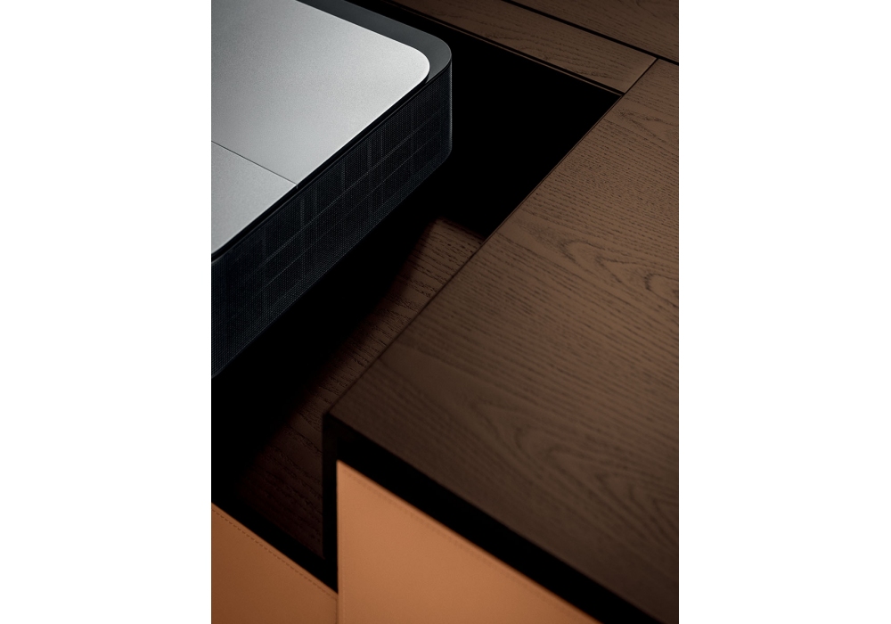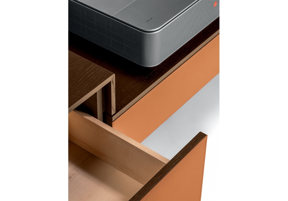 Fidelio Multimedia Cabinet designed by Roberto Lazzeroni in collaboration with Leica for Poltrona Frau, is an elegant and technological piece of furniture designed for the Leica Cine 1 projector. Made of mocha-stained ash and natural maple, it houses a top with a motorized door that hides the projection screen. It includes two side drawers with a push-pull system and leather fronts, and a removable central compartment for positioning the projector. The base in ash and matt black steel is equipped with adjustable feet. Back with removable panels for cable passage and inspection. Available with tone-on-tone or contrasting stitching.