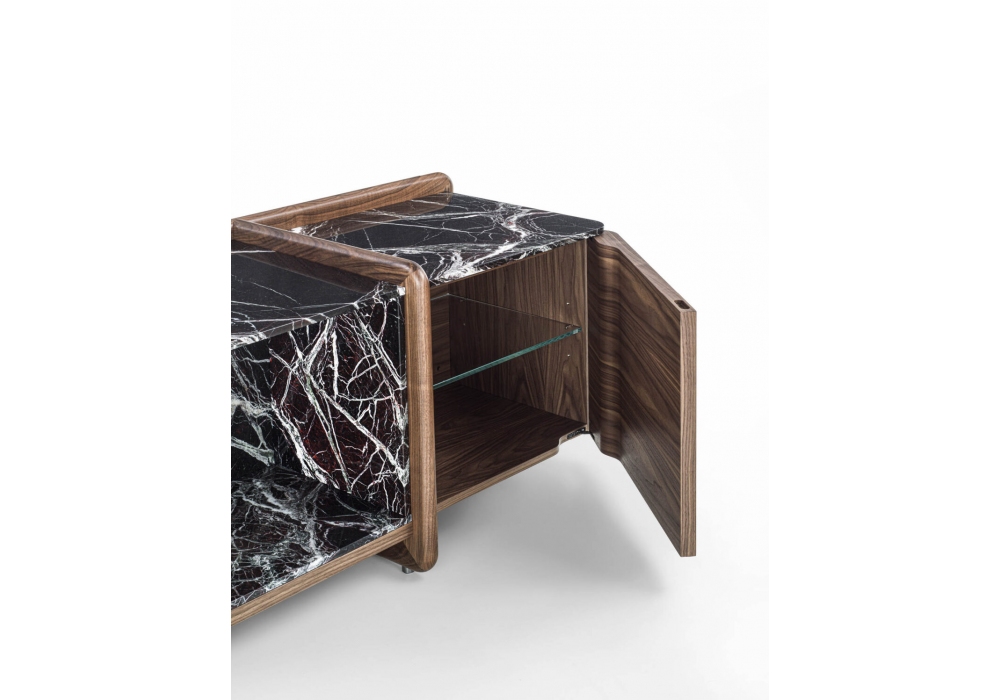 Akeru designed by Giuseppe Viganò for Porada is a sideboard with a canaletta walnut structure in various finishes and metal feet in pewter finish. The top is made of marble. Central open compartment in wood or marble in the same color. Side doors with push-pull opening and recessed handle, wooden fronts and internal glass shelvesAlso available is the Akeru Box container in extra-clear glass.