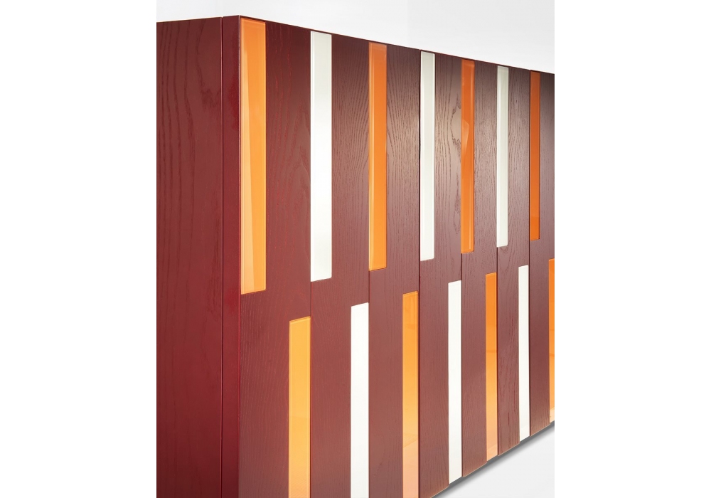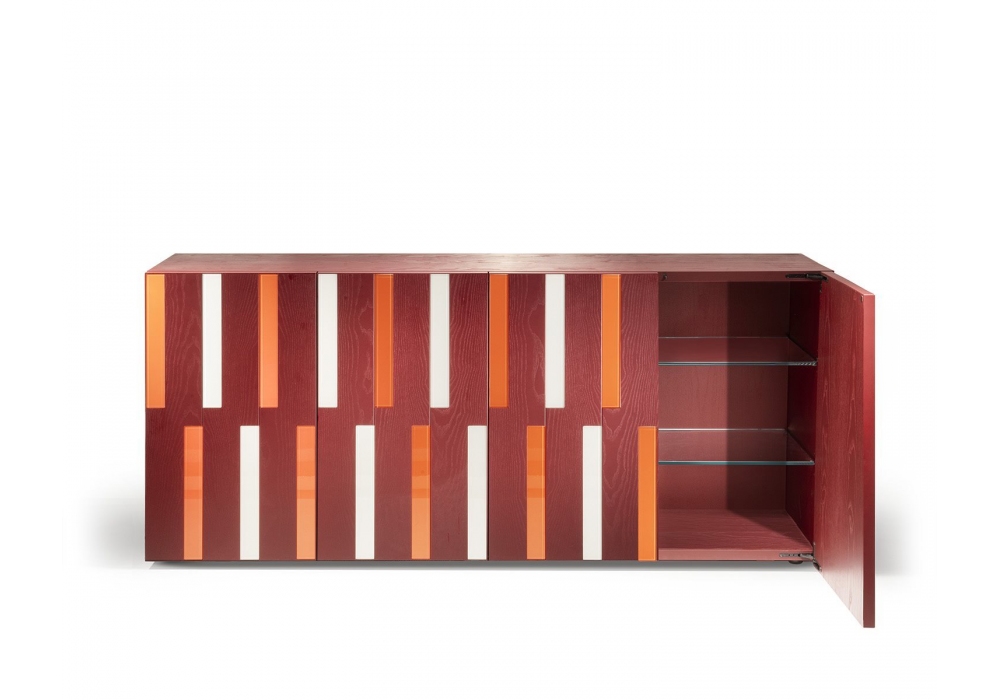 Riga-Riga designed by Pierre Charpin for Zanotta is a sideboard with an MDF structure veneered in open pore lacquered ash in black or amaranth. Inserts in back-painted glass in mint and sky blue for the black version or ivory and coral for the amaranth version. Adjustable internal shelves in extra-clear tempered glass. Upon request, a neutral light LED light source can be integrated inside the compartment.