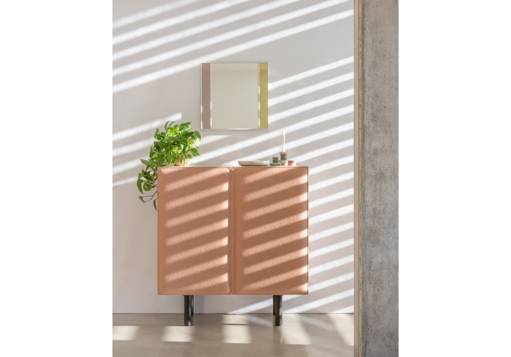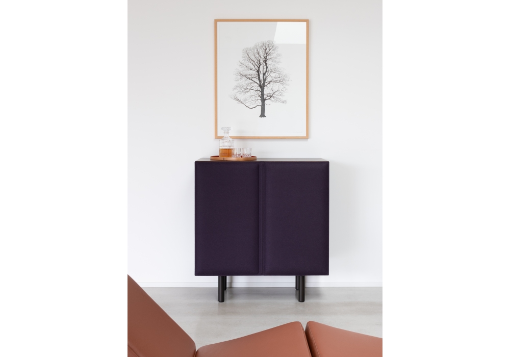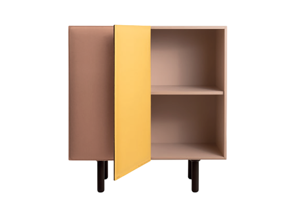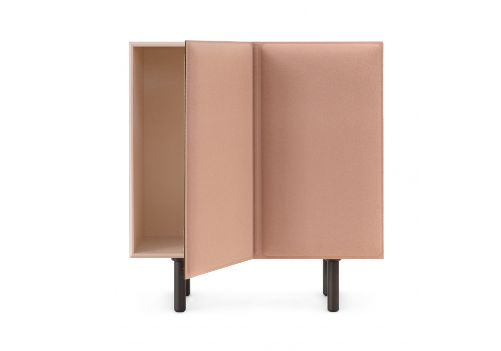 Tacito designed by Alessandro Stabile for Magis is a tall storage unit with a structure (sides, back and shelves) in painted MDF, felt doors and legs in anodized aluminum in a dark brown finish.