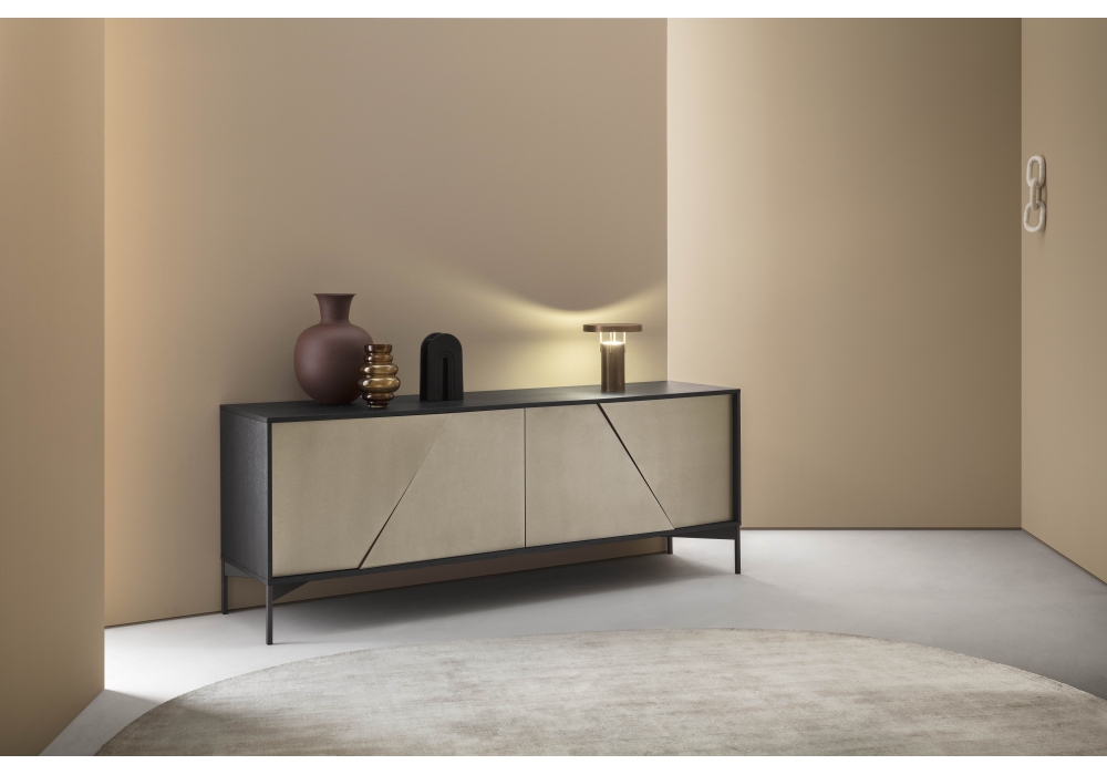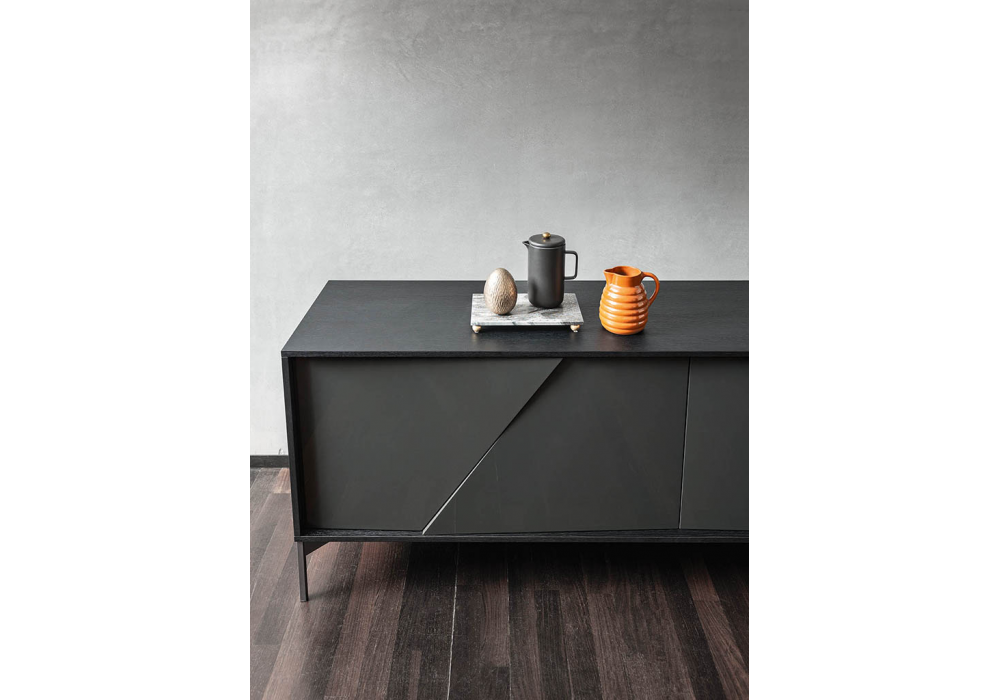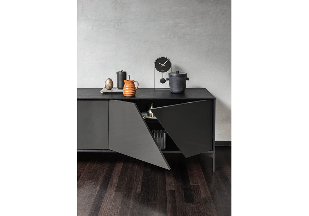 Kendo designed by Meneghello Paolelli associati for Alf Dafrè is a sideboard with melamine or lacquered structure. Metal base in Moka Shine finish and back in Metal Smoke melamine. There are shelves in gray transparent glass. Doors with push-pull openings.