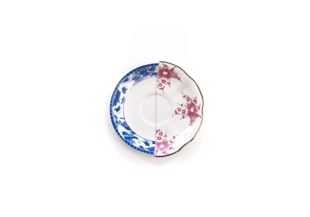 Hybrid Zenobia firmata da CTRLZAK per Seletti è una tazzina da thè con piattino in porcellana bianca con manico dorato. Il set è realizzato dal connubbio di due forme differenti con stampe colorate ai lati e sul piano del paittino.