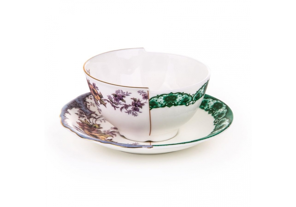 Hybrid Isidora firmata da CTRLZAK per Seletti è una tazzina da thè con piattino in porcellana bianca con manico dorato. Il set è realizzato dal connubbio di due forme differenti con stampe colorate ai lati e sul piano del paittino.