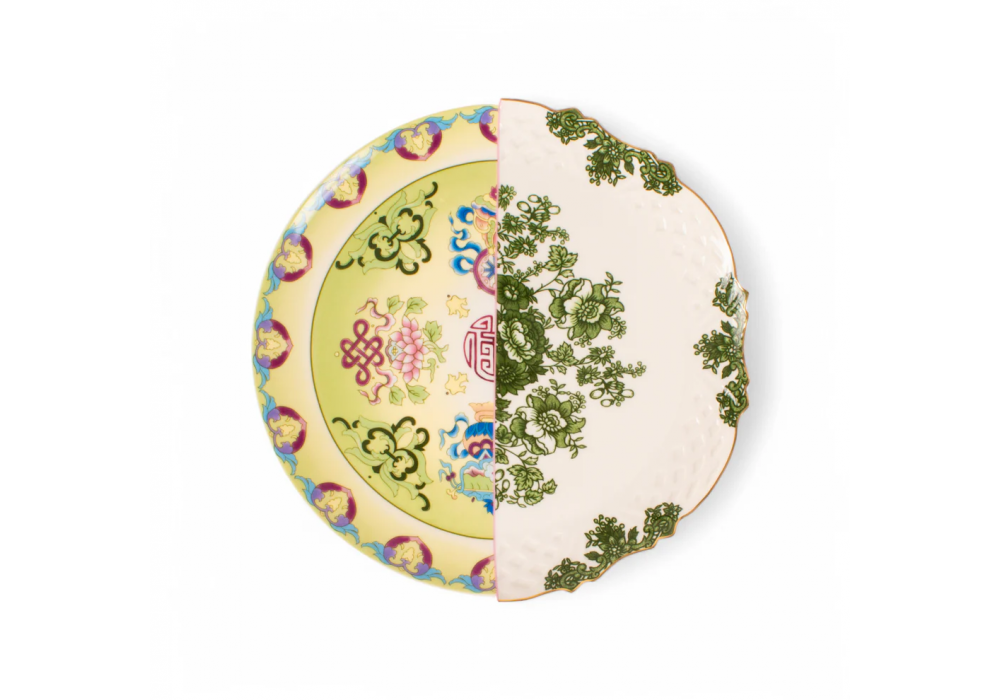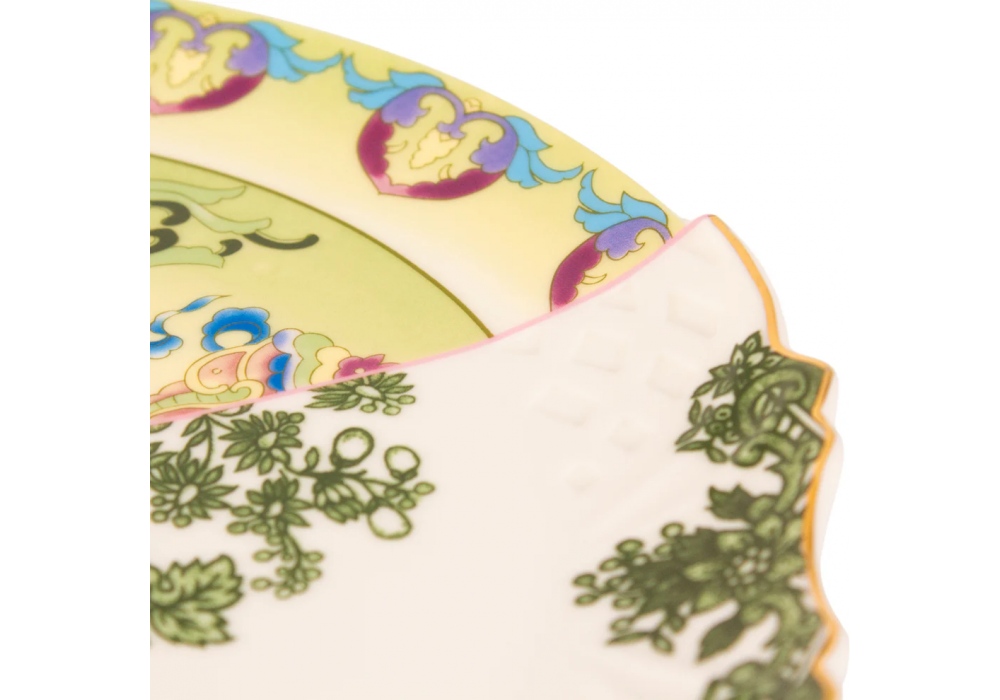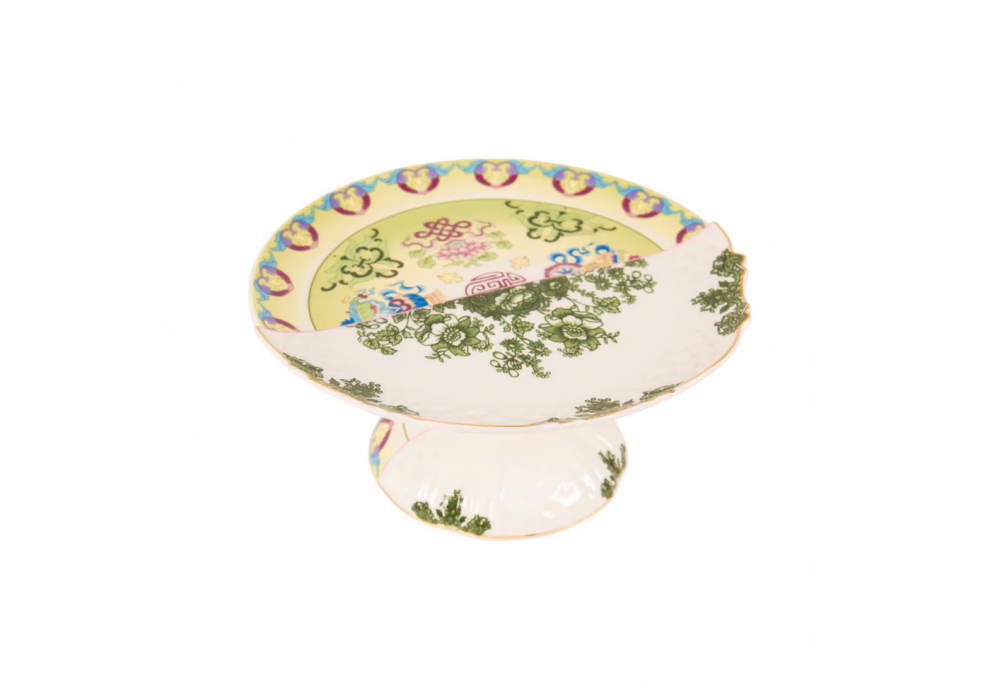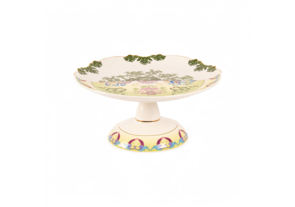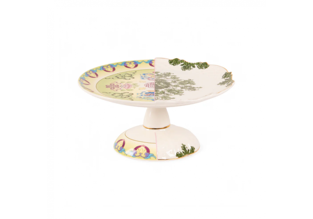 Hybrid Raissa designed by CtrlZac for Seletti is a circular cake stand entirely made of porcelain decorated with various figures and pigments.