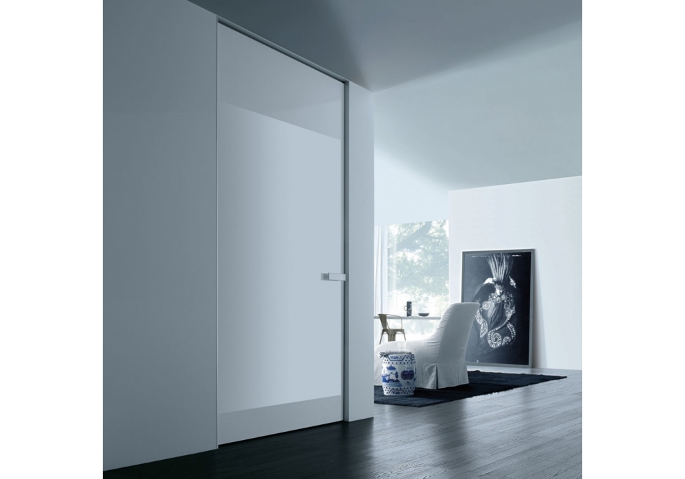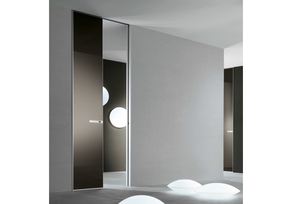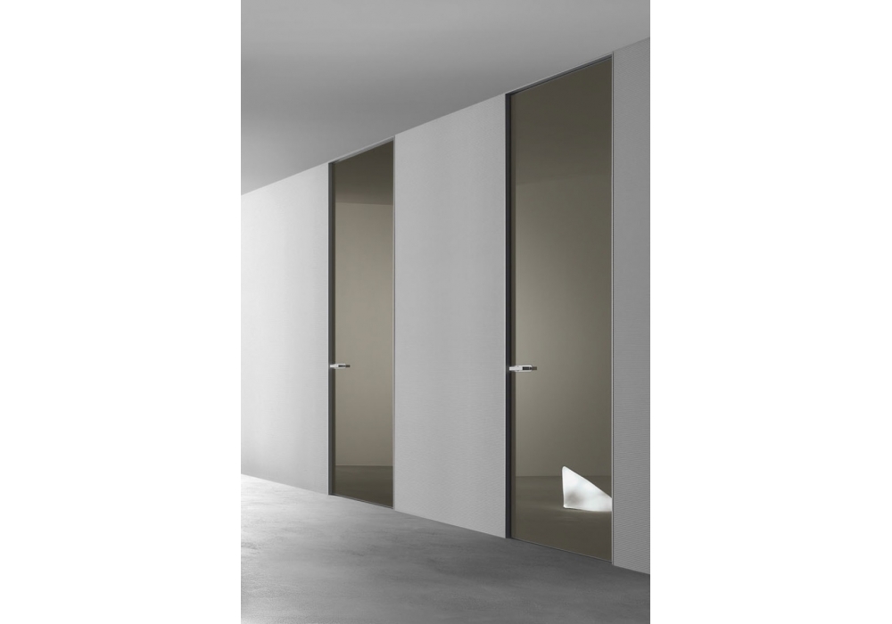 Aura designed by Giuseppe Bavuso is a new step in Rimadesio’s path of design for internal doors. The idea of a surface of lacquered glass with a thin aluminium frame that fuses into the walls in an increasing measure. It has a thin aluminium surround. Aura is perfectly two-sided, equipped with a two-way opening and a patented magnetic closing system that cannot be seen.