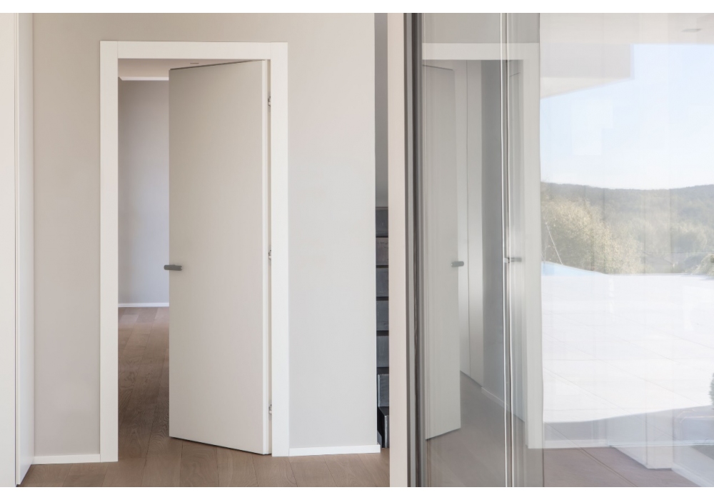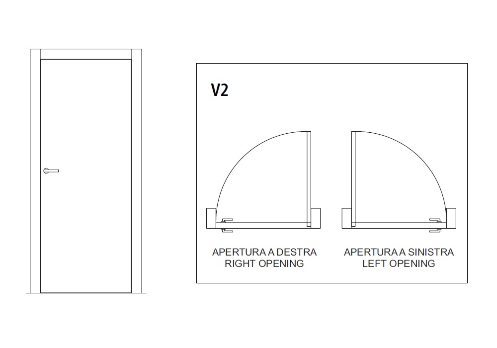 V2 designed by Viva is a swing door complete with door, jambs and architraves. Glossy or matt lacquer. Available in different finishes and versions.