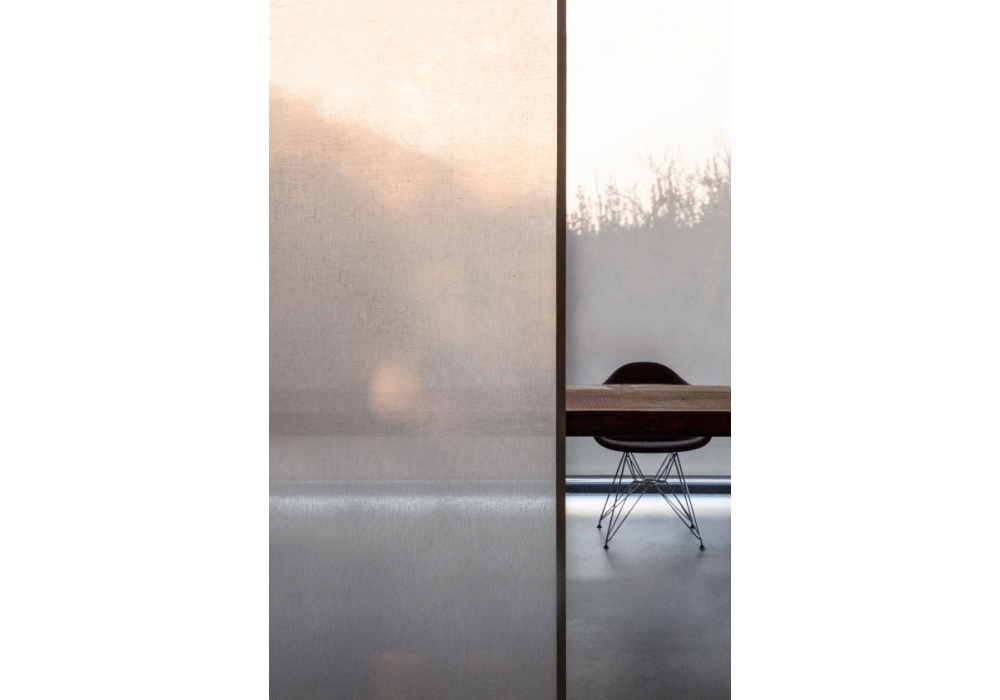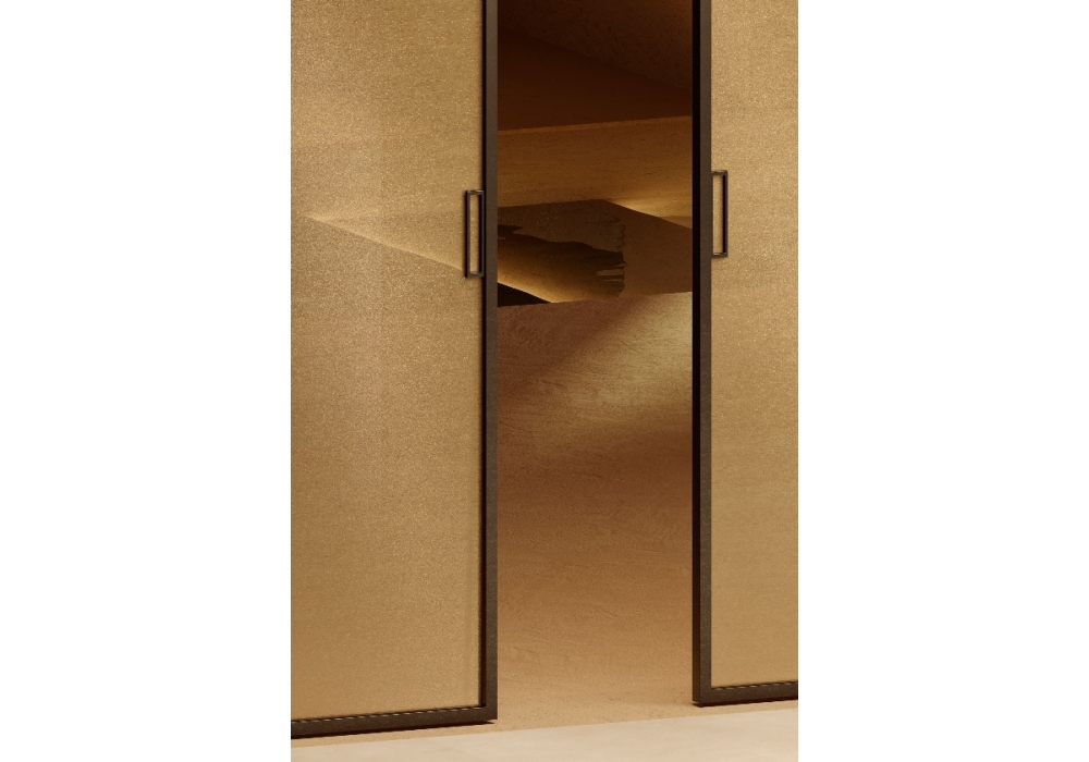 Bellagio designed by Viva is a sliding door in glass or with fabric covering. Aluminum frame. Available in different finishes.