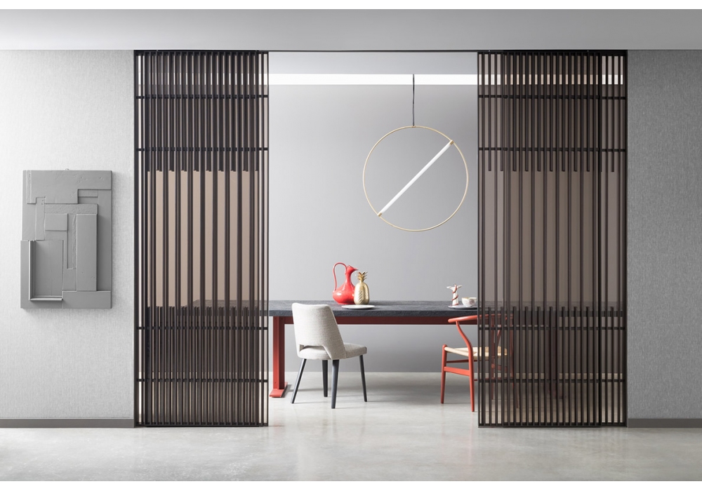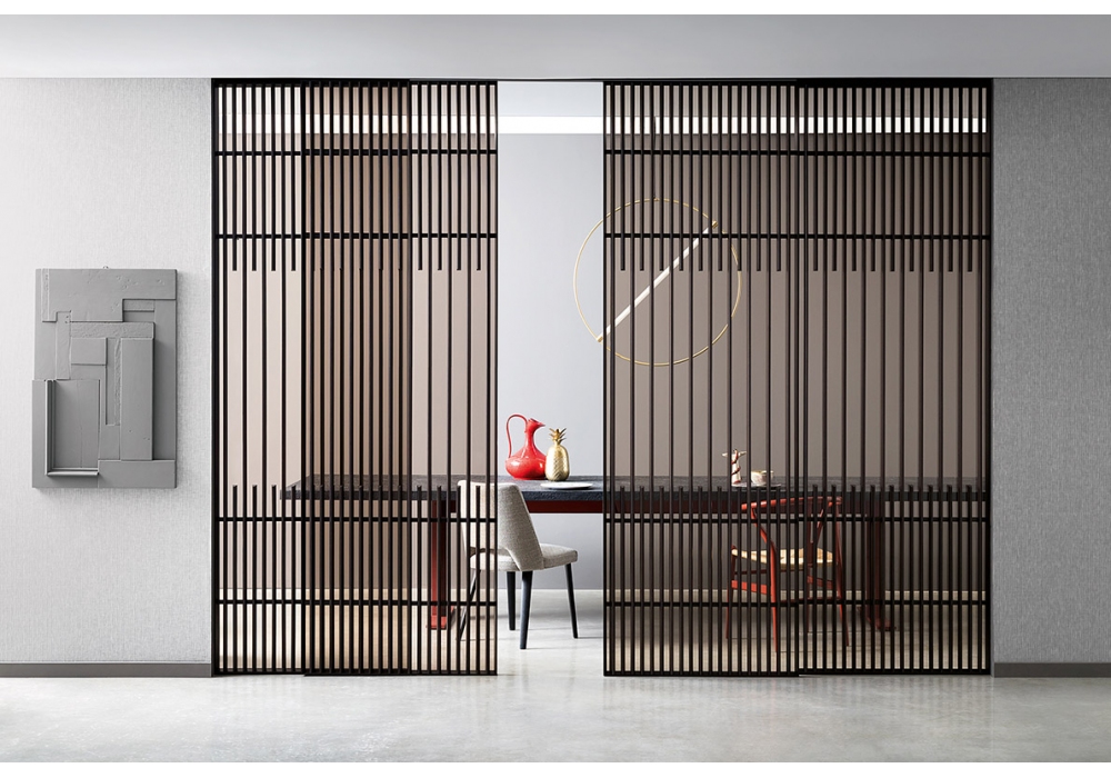 Koan designed by Kokaistudios for Lualdi is a sliding door in glass, wood and aluminum. This sliding door for interiors features an unprecedented combination of vertical slats that alternate over variable lengths. Available in different finishes.