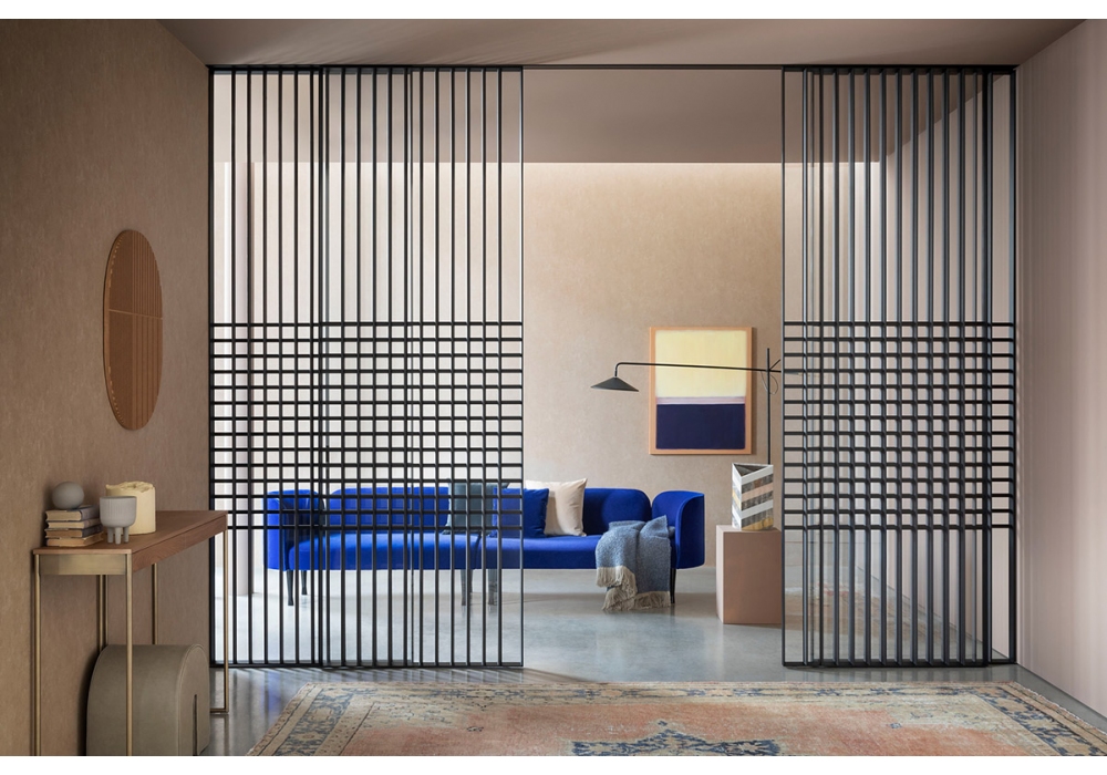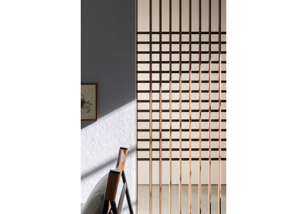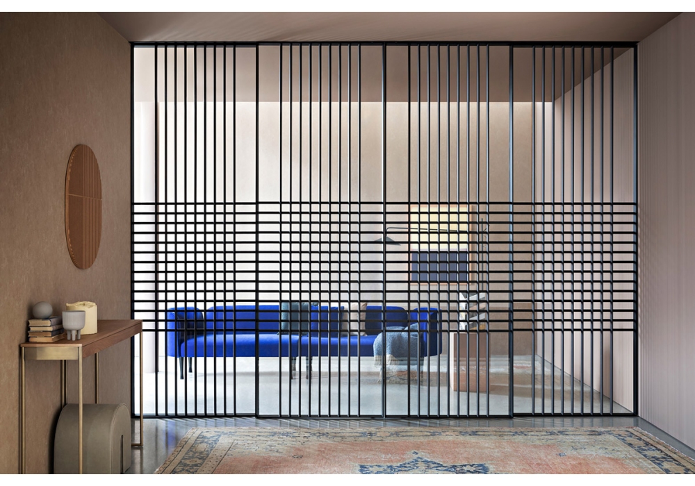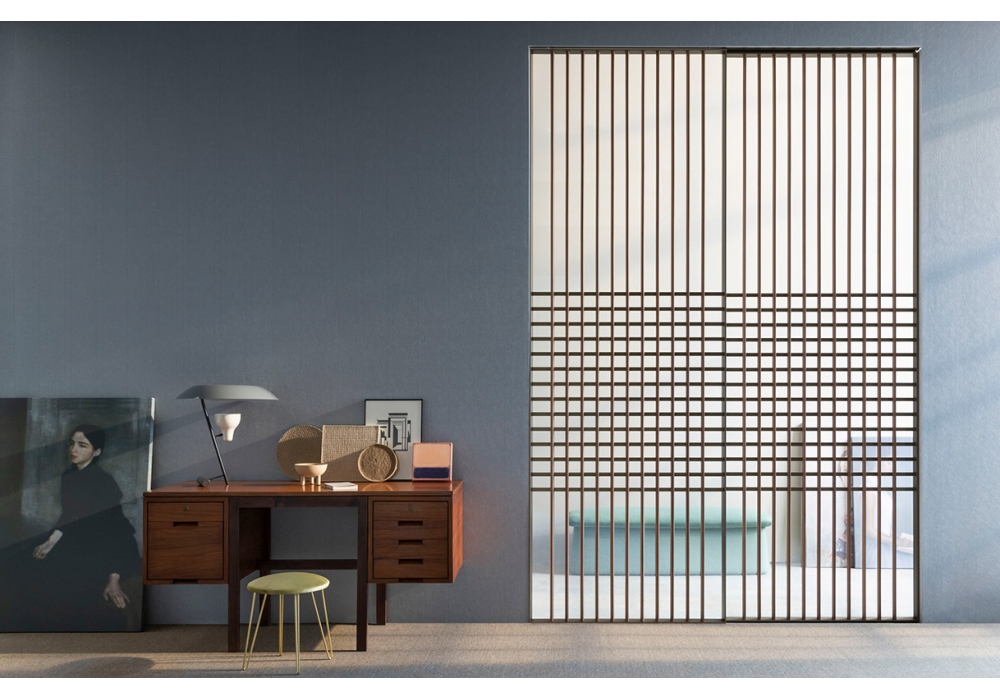 Koan Plus designed by Kokaistudios for Lualdi is a glass, wood and aluminum sliding door with a configurable system composed of fixed and sliding panels. This sliding door for interiors features a combination of vertical slats that alternate over variable lengths. Available in different finishes.