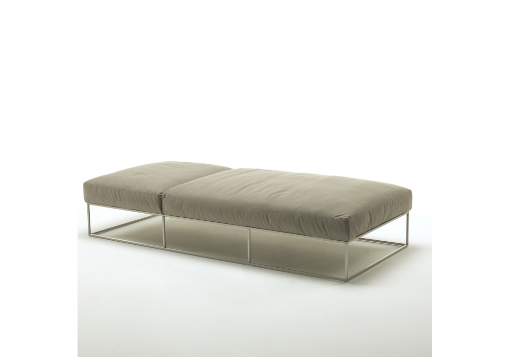 Ile Club designed by Piero Lissoni for Living Divani is a daybed. Seat chassis in lacquered steel with coated rubber elastic straps. Backrest in plywood panel adjustable through a mechanism. Seat and back cushions padded with differentiated density polyurethane foam and Visco-soft “Xtra-pur”, covered with a quilted mat in prewashed and sterilized goose down, stitched into separate compartments, or covered with acrylic fibre layers. AISI 304 stainless steel square section tube base, matt satin-finished. Fabric or leather upholstery, both fully removable by zippers and Velcro fastenings.