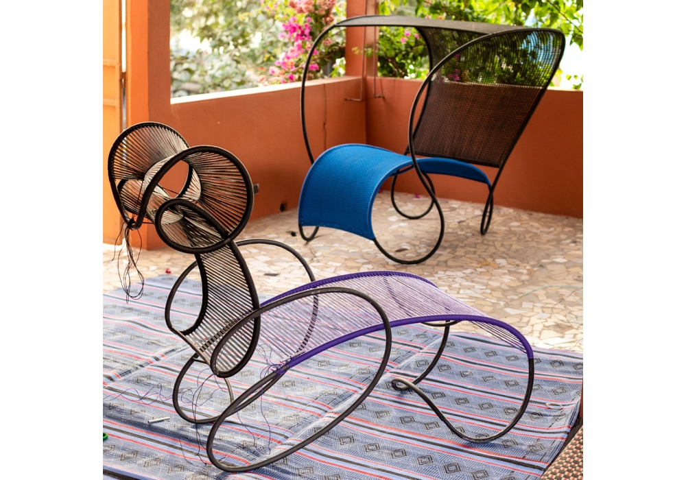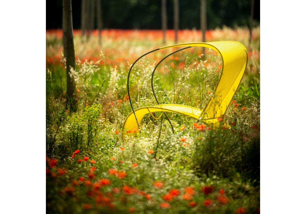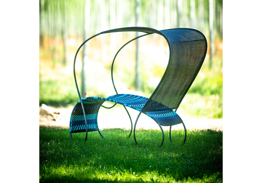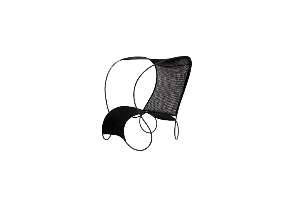 Modou designed by Ron Arad for Moroso is a daybed made of rust-proofed tubular steel frame and wrapped with handwoven polyethylene cord. PVC glides.