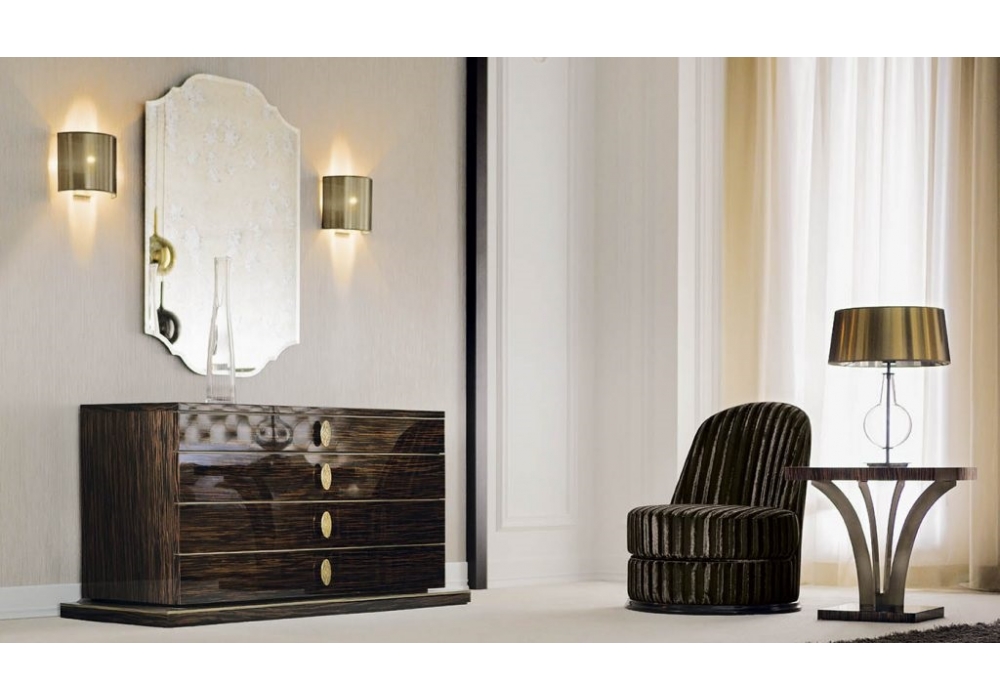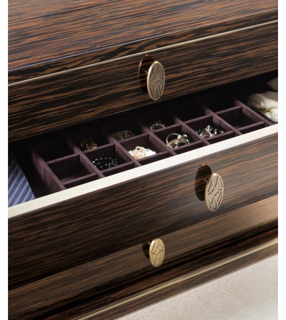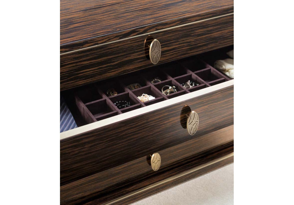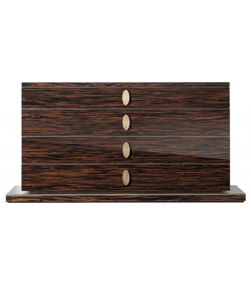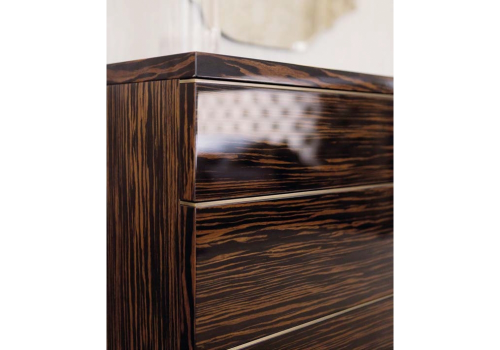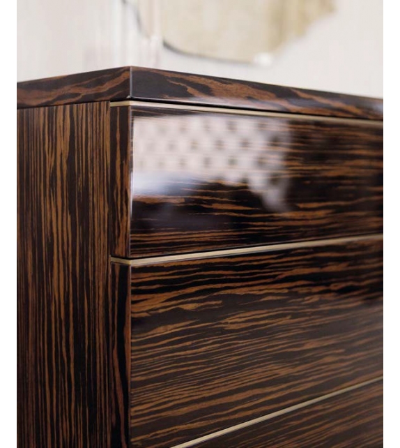 Orfeo designed by Angelo Capellini Staff for Opera Contemporary is a chest with 4 drawers made in precious Macassar ebony veneer glossy finishing enriched by brushed brass handles & profiles.